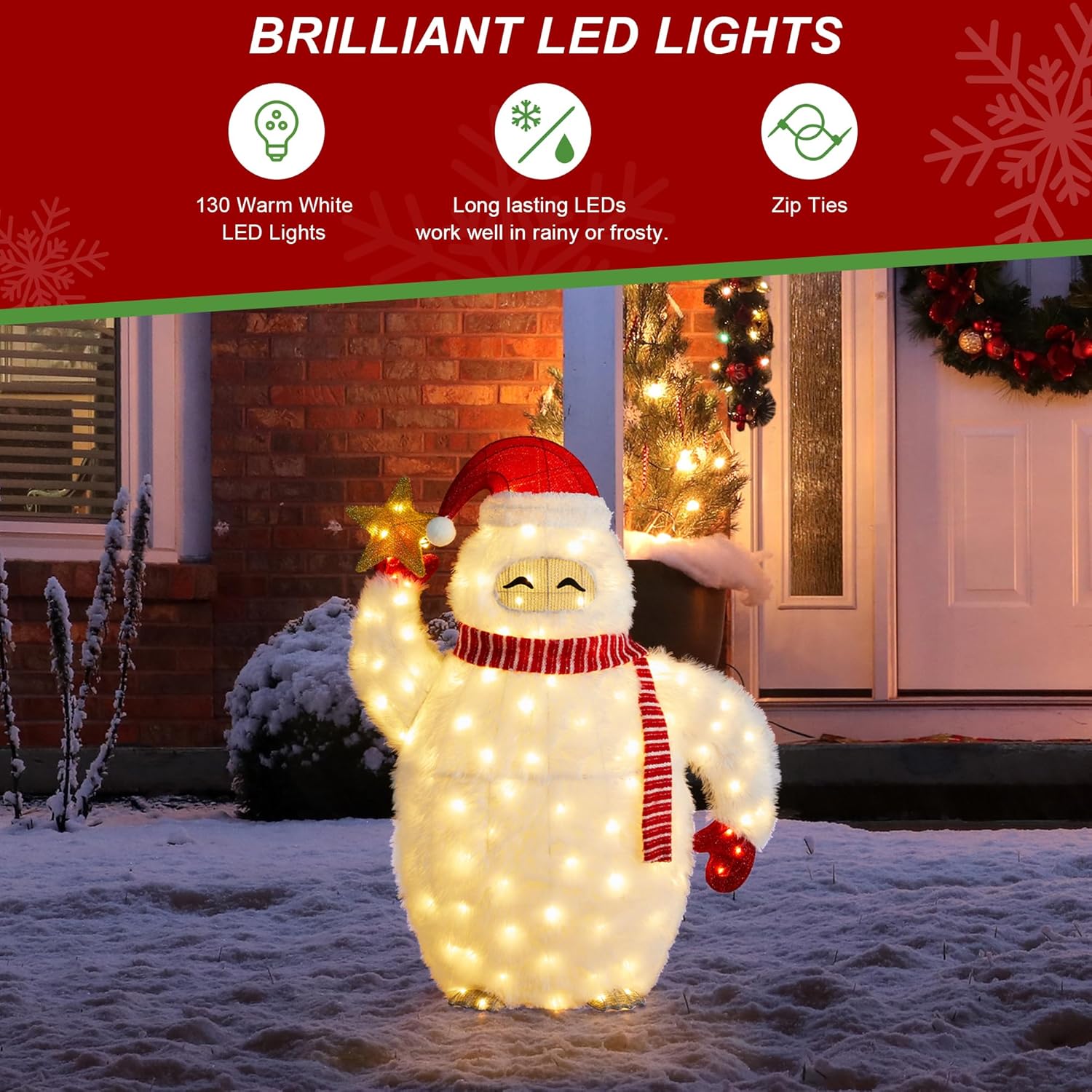 Transform your home into a magical winter wonderland with this enchanting 3D Yeti Christmas decoration! Imagine the joy it brings as its warm white LEDs twinkle under the starlit sky, greeting guests with a cheerful glow. Whether placed beside a festive wreath or alongside a decorated Christmas tree, this whimsical yeti becomes the centerpiece of your holiday storytelling, evoking the spirit of legendary snow-filled tales.Crafted for durability, the yeti’s fabric-and-iron frame stands firm against snow, rain, or wind, while the 130 LEDs—engineered for long-lasting performance—cast a soothing radiance that complements other holiday lights. Its friendly expression and Santa hat add a touch of nostalgia, making it a hit with children and adults alike. As you host gatherings or enjoy quiet evenings, this yeti symbolizes the season’s magic, blending tradition with a hint of adventure.Specifications:Dimensions: 32.5" L x 11.75" W x 42" HWeight: 5.07 lbsMaterials: Fabric 40%, PVC 10%, Iron 30%, LED 20%Lighting: 130 warm white LEDs, UL Listed for safetyPower: Standard plug-in (120V)Use: Indoor/outdoor; weather-resistant for year-round displayEmbrace the holiday spirit with a decoration that combines functionality and fantasy—ideal for gifting or elevating your seasonal decor!