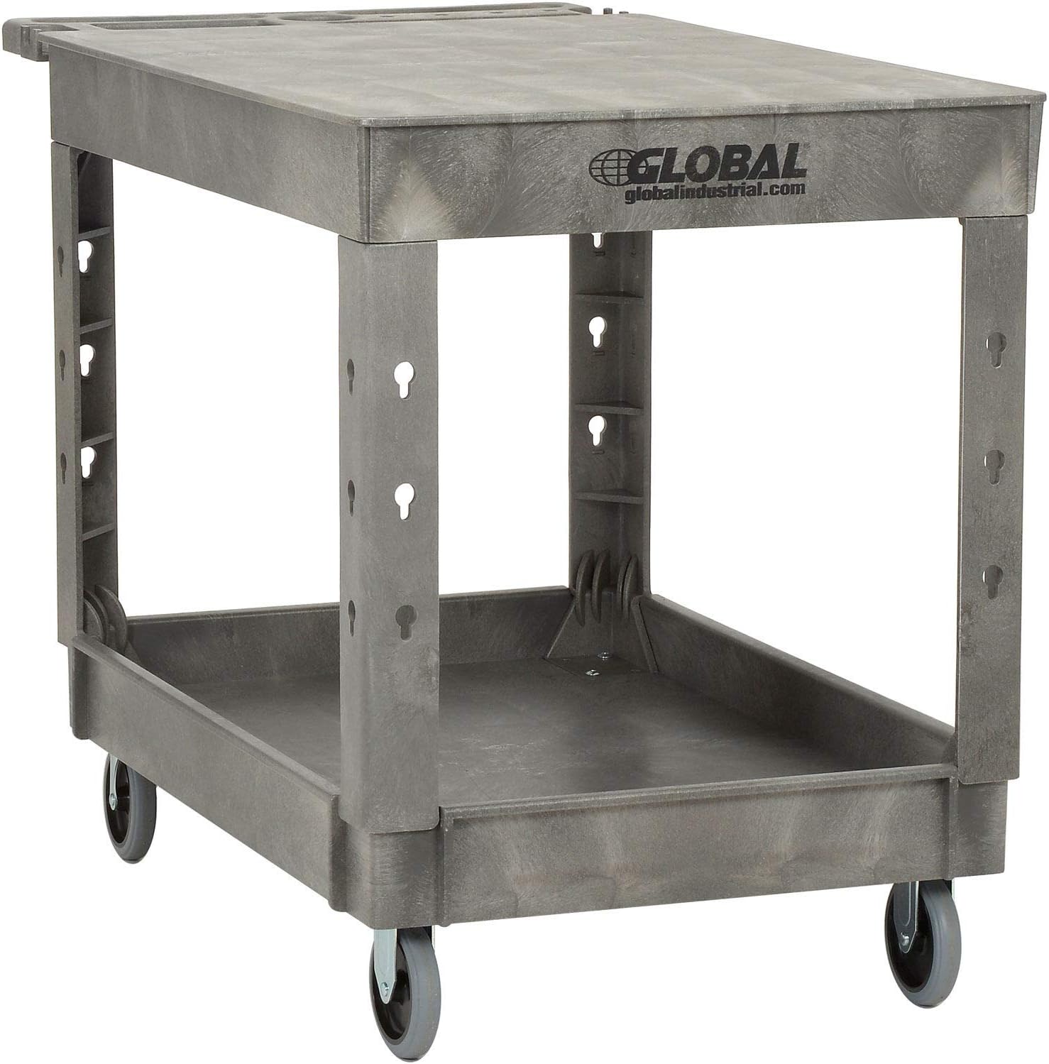 Make your move with this Industrial Strength plastic stock and utility cart. This high quality cart is virtually maintenance free and perfect for industrial, commercial, medical, or food service applications. Easy-to-clean structural plastic cart won't rust, dent, peel, or chip. Cart features smooth flat top shelf for work surface or easy loading/unloading of oversized cargo and a 2-5/8" bottom, leak-proof tray shelf with 2 swivel and 2 rigid non-marking 5" rubber casters. Comfort grip push handle for effortless steering. 1 Year Limited Warranty. Cart Features: Molded-in tablet holder, Drill/Cup holder, Storage tray, (4) Screw driver holders, (2) Tool/Bag hooks on left and right ends of the handle, Support legs offer 4" spaced slots on each side of the legs to hold specialized accessories to increase your productivity. Choose from hooks, spool holders or utility bins, ladder holders and power strips all designed to improve the functionality of these carts, sold separately. 500 lb. capacity; 250 lb. per shelf evenly distributed. Easy assembly.