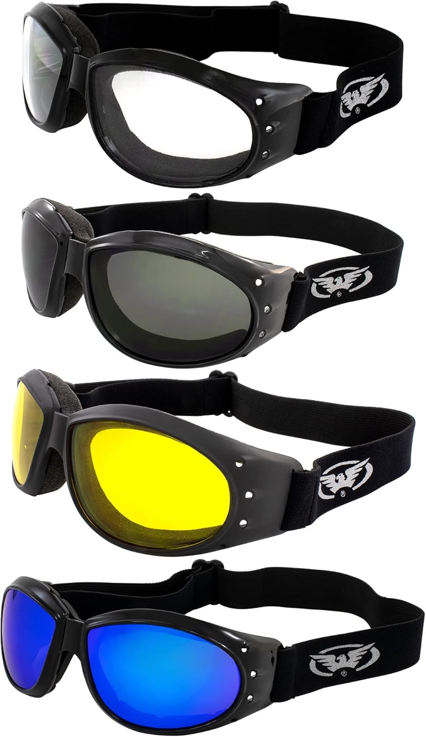 Get that motor running and roll out on the highway in safety and style with a set of Global Vision Eliminator padded motorcycle goggles. Don't let anything get in the way of your good time, especially not the wind, dirt, rain sure to hit you smack in the eye if you're not wearing the right eye gear. You'll get a pair of clear lens goggles and a pair of yellow lens goggles for night riding plus a pair with smoke lenses for the day. Each pair is encased in black, softly padded frames said to be so soft and thick that you won't feel the frame's plastic edges even on the highway. Additional features include scratch-resistant coating and shatterproof polycarbonate lenses complete with a UV400 filter for maximum UV protection. Side venting helps prevent fogging. You always go the distance and then some, so make sure you strap on the ultimate protection needed for all of your riding adventures. These goggles are sure to keep you safe and stylish...no matter where the road takes you.