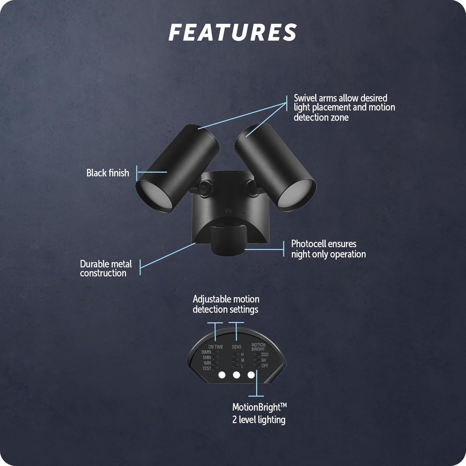 Discover the pinnacle of security with the Motion Activated Adjustable Swivel Arm Architectural Security Light! Motion activated from up to 50 feet/15 meters, with a 180° detection zone, your home will never be more secure. Easily customize the lighting by adjusting the lamp heads to fit your unique space. With 2000 lumens and a daylight white 4000 Kelvin color temperature, experience a bright white light that enhances security all night long, providing a feeling of safety for seconds at a time. The MOTIONBRIGHT feature allows you to have constant low ambient lighting when no motion is detected and full brightness when motion IS detected, saving energy while staying safe. Installation is a breeze with the included mounting hardware. Built to withstand any outdoor environment, this light fixture is constructed of durable materials, weather-resistant, and outdoor-rated. Backed by a 5-year warranty, trust in the Globe Electric commitment to quality.