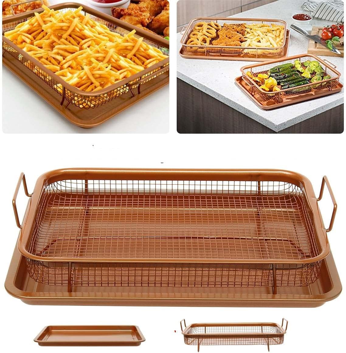 Technical Specifications:Color: CopperType: Storage TraysFeature:Non-Stick,Heat Resistance,Easily edMaterial: Stainless steelShape: Rectangle--- Tray Size ---Length: 32.5cm/12.8"Width: 24.5cm/9.6"Height: 2cm/0.8"--- Mesh Size ---Length: 31.5cm/12.4"Width: 22.5cm/8.8"Height: 8.4cm/3.3"Features and Benefits:● Allows air to circulate around your food for crispy results without flipping● The rack keeps your bacon lifted away from grease, lower fat way to make crispy bacon every day● Get even results cooking foods such as oven fries, pizzas and more● For non-stick performance and easy up● Oven safe up to 500 degrees F● Dishwasher safe so up is easyNotice:1. Please allow 1-3mm error due to manual measurement.Pls make sure you do not mind before you bid.2. The color may have different as the difference display,pls understand.Package Contents:1 x Bottom Tray1 x Mesh BasketAvoid cold pot cold oil. Don't make starchy foods at the beginnings can achieve non-stick effect in the later stage.
