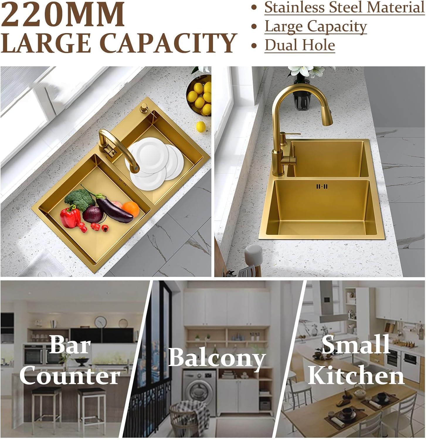 Elevate your kitchen's style and functionality with our luxurious gold brushed double-bowl sink. Crafted from high-quality stainless steel, this sink harmonizes aesthetics and performance, ensuring your kitchen becomes a true centerpiece.🥳Sink Specifications✔ Material: Stainless Steel✔ Color: Elegant Gold✔ Sizes Available: 75x40cm, 80x45cm✔ Installation Types: Top Mount, Flush Mount, Undermount✔ Included in Package: Sink, drain basket, and comprehensive drain system🤩Key FeaturesElegant Gold Finish: Adds a touch of luxury to your kitchen with its gold brushed finish and sleek design.Effective Drainage System: Includes a removable drain cover for easy cleaning and maintenance, promoting smooth water flow.Noise Reduction: Advanced soundproofing technology and rubber pads minimize noise, providing a quieter kitchen environment.😇Elevate your kitchen with our sophisticated and functional sink. For any questions or support, our friendly customer service team is here to assist.