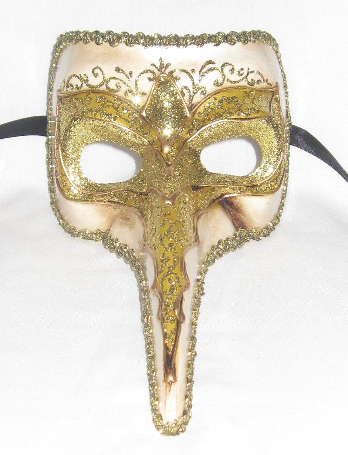 Hand made and hand decorated Venetian " Nasone S. Marco " mask from Venice, Italy. This is a classic medium nose mask. The mask is painted creme and gold, with gold glitter accents. This mask is 5 inches high, 11 inches long All of our masks come with a tag guaranteeing authenticity from Venice, Italy. Light enough to be worn or a great wall decoration.