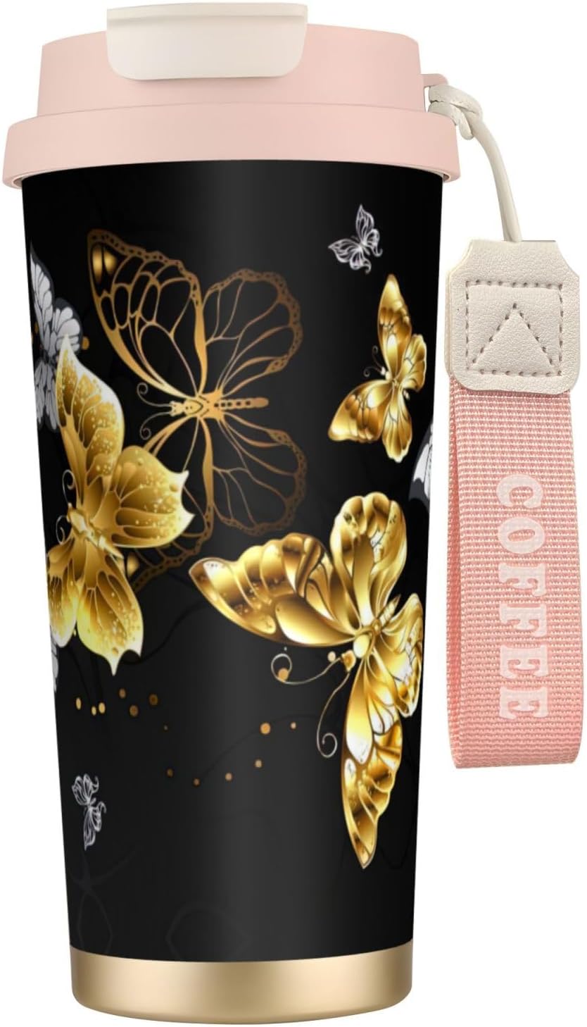This Gold White Butterflies Black Print travel Coffee Mug supports three drinking modes: the direct drink spout for quick drinks during commutes, the straw port for iced coffee and other spill prone beverages, and the open top design that replicates the traditional coffee cup experience. BPA Free 316 Stainless Steel, Safe and Durable Inner liner made of food grade 316 stainless steel, non toxic, odorless, BPA free, safe for long term use.
