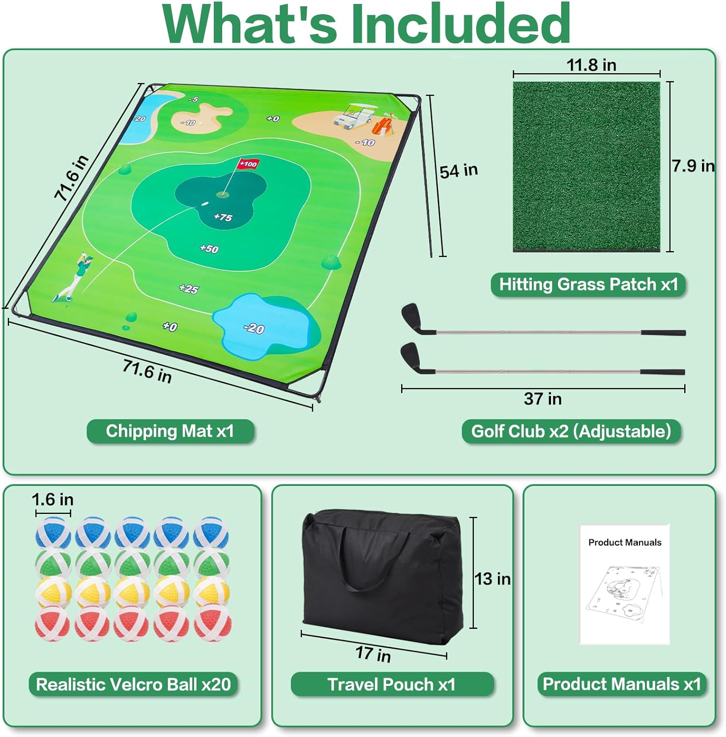 | Included Components | chipping mat x 1; golf clubx2;Hitting Grass Patch x1; Ball x20;Travel Pouch x1;Manuals x1 |