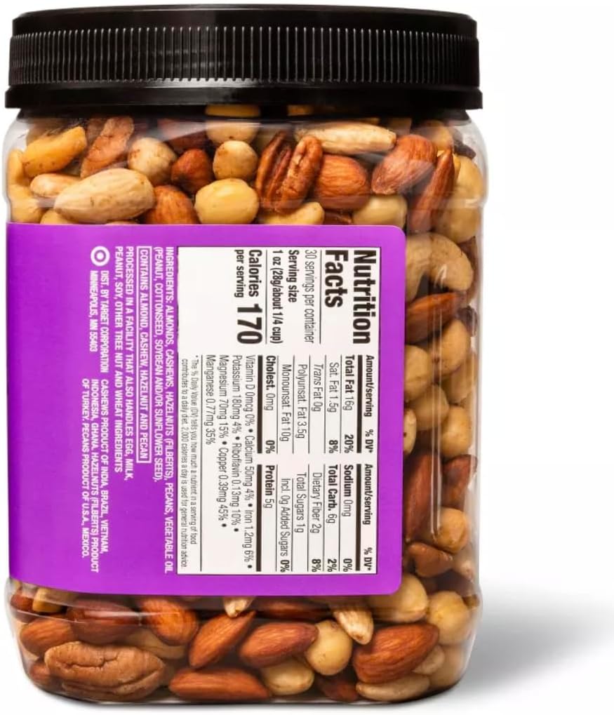 These Unsalted* Roasted Mixed Nuts from Good & Gather are great for entertaining, afternoon snacking, baking and more, making for a versatile pantry staple you won't want to go without. In a large container that's perfect for stashing in your desk at work, keeping on the kitchen counter or sharing with friends, this mix has something for everyone. Almonds, cashews, hazelnuts and pecans all feature, and each is roasted just right to bring out their individual natural flavors for a craveable snack you can feel great about eating. Mix a handful into your morning oats for a crunchy start to your day, or go the indulgent route with melted caramel and chocolate to create nut clusters everyone will want the recipe for.
