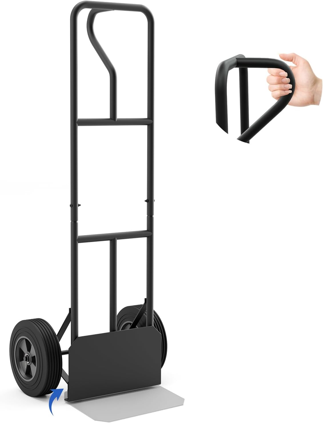 DescriptionThis P-handle hand truck will be a great choice for house moving, commercial product distribution or other activities!Designed with a P-handle and 10” wheels, this sack barrow allows you to lay it flat for easy loading. Moreover, the 660 lbs weight capacity and high back design make this hand truck ready to load more goods. And then, the handle and wheels are gonna help you use this trolley effortlessly. The P-handle is aimed at single-handle operation. And the 10” all-terrain wheels are convenient for you to push this dolly on different roads. After using it, you can fold the load plate for easy storage.FeatureP-handle for one-hand operationLoad large goods easily thanks to its high back designHeavy-duty metal frame for 660 lbs weight capacityEnsure a long service time with rustproof surface10 inches solid wheels for different roadsQuiet to push with built-in double bearingsCan lie flat for loading of goods convenientlySuitable for house moving, beverage delivery or commercial product distributionFolding load plate for easy storage and space-savingSimple installation requiredSpecificationColor: Black/RedMaterial: Metal, PlasticUnfolding Dimension: 20” x 19” x 52” (L x W x H)Folding Dimension: 20” x 12” x 52” (L x W x H)Diameter of Each Wheels: 10”Weight Capacity: 660 lbsNet Weight: 28 lbsPackage includes:1 x Hand Truck1 x Instruction