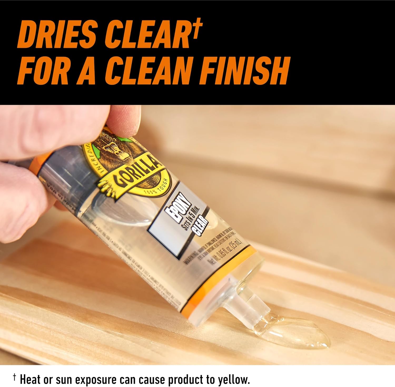 Gorilla 101563 Epoxy Tough and Clear Glue 25 ml is water resistant and dries clear. 5 minute set time. Easy to use syringe. Incredibly strong and durable for household.