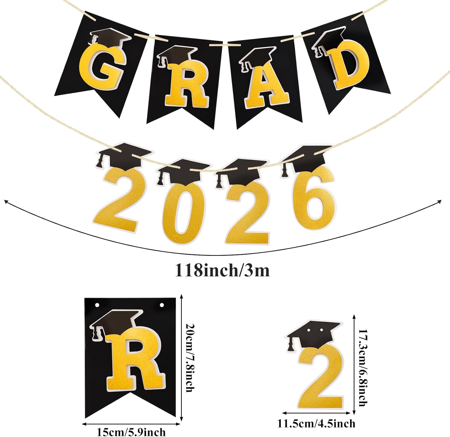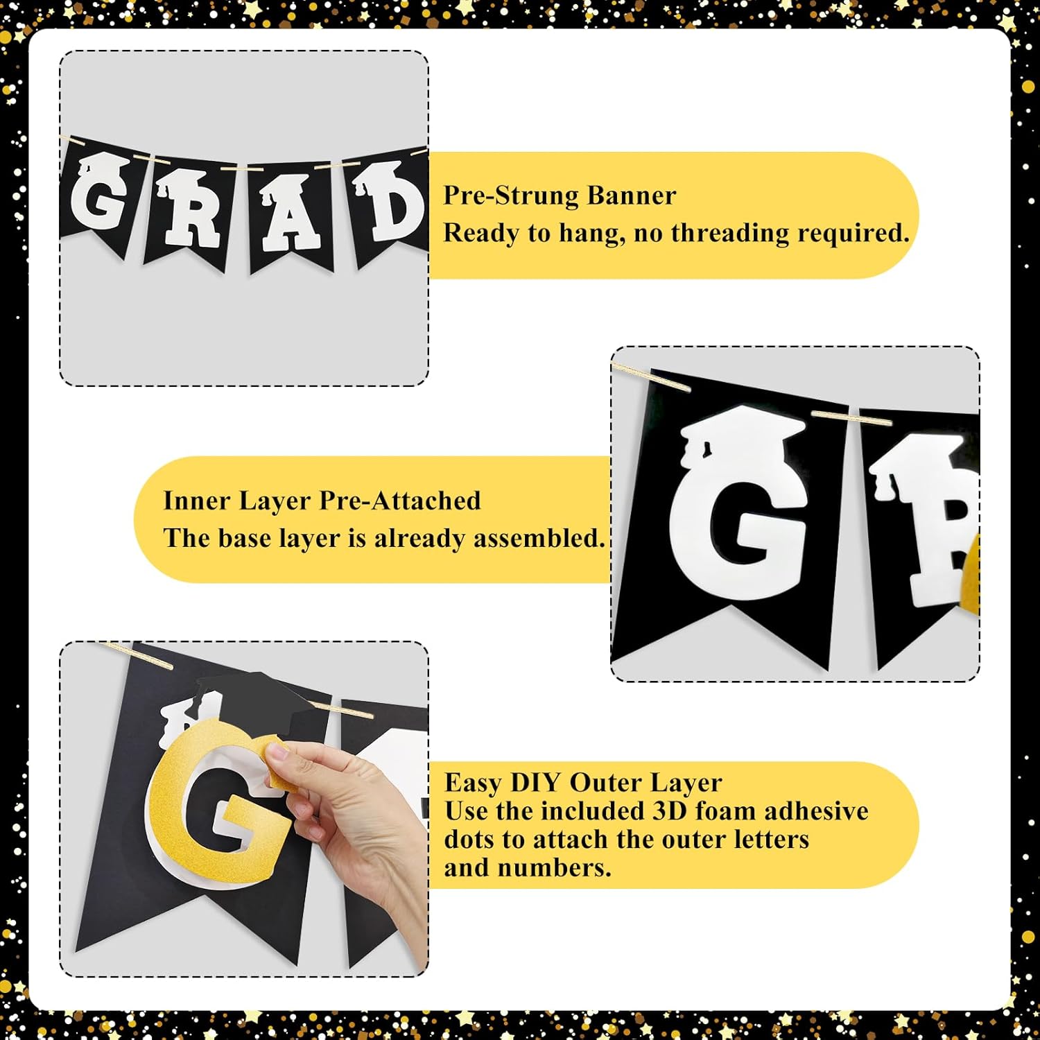 Make decorating simple and meaningful with this GRAD 2026 Pre-Strung 3D Graduation Banner. The banner arrives fully strung and neatly assembled, allowing you to hang it immediately without sorting or threading pieces.To create the dimensional look, simply attach the outer layer of letters and numbers using the included 48 thick foam adhesive dots (approx. 10mm thickness). This easy DIY step adds depth and texture while keeping setup fast and stress-free.Featuring a classic black and gold color palette with graduation cap details, this banner complements a wide range of graduation themes and ages. Designed for indoor or outdoor use, it creates a polished backdrop for photos and a memorable graduation atmosphere.