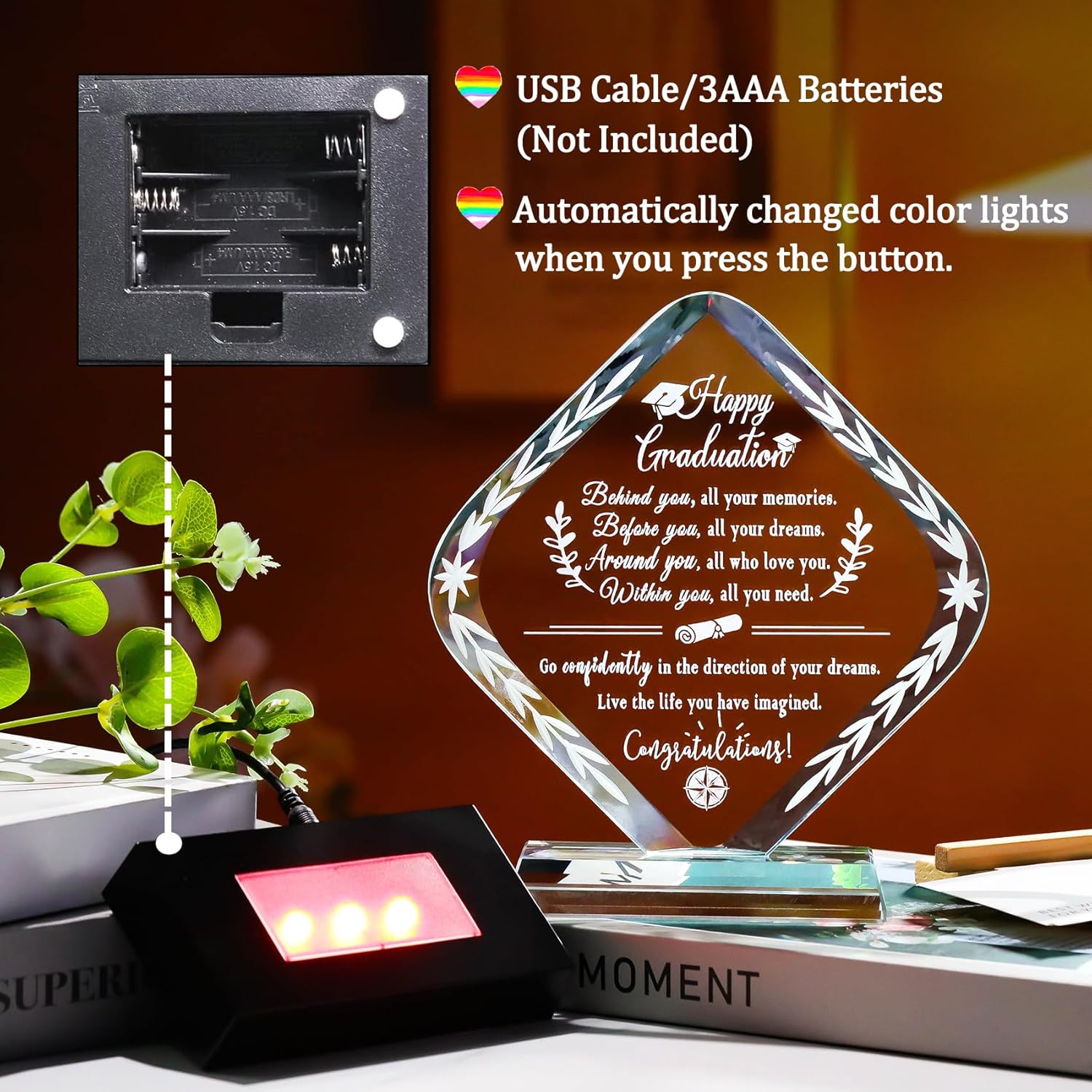 | Included Components | Graduation Glass Plaque, LED light base, USB cable, Gift Box, Wish Card, Wipe Cloth |