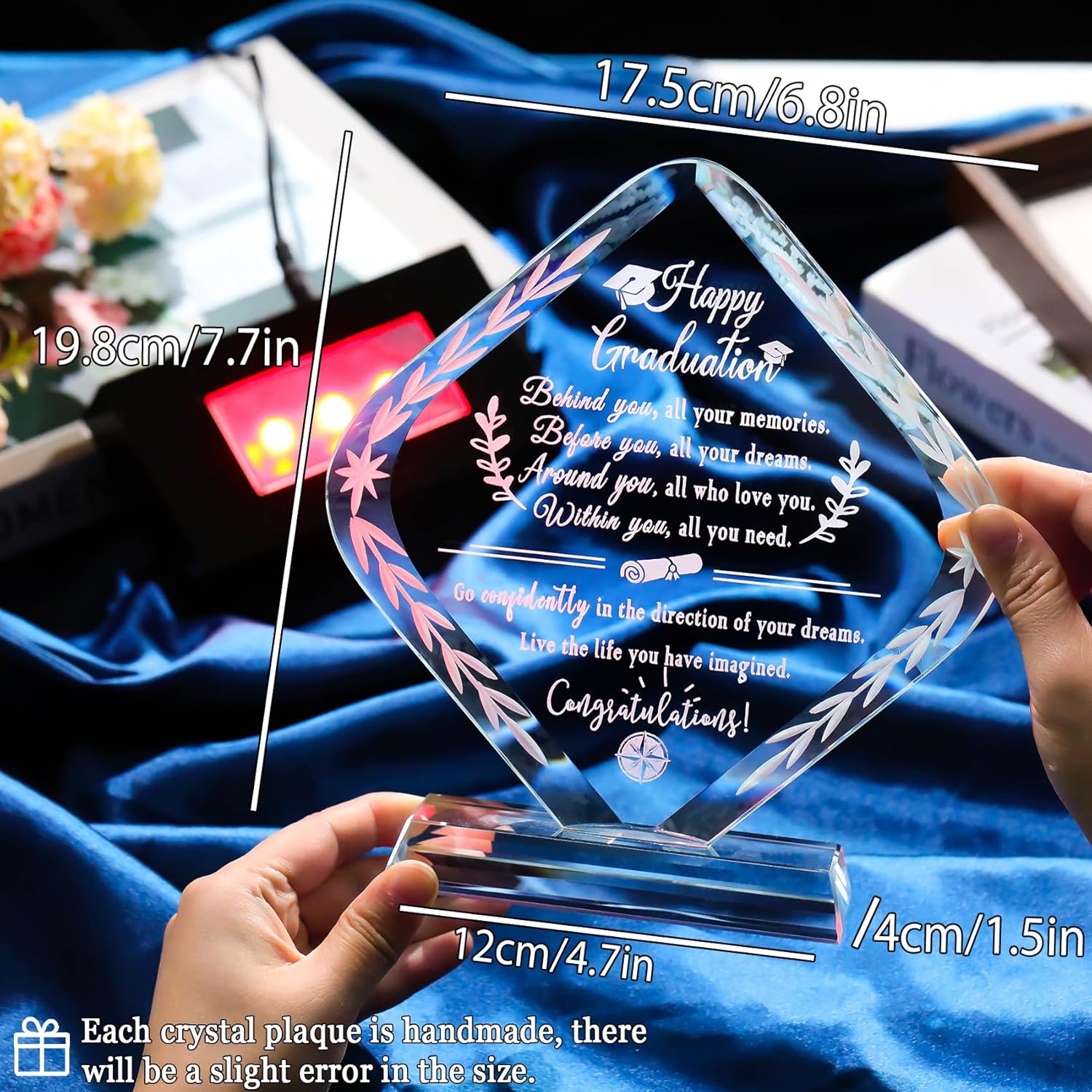 Product Specification: Material: Crystal Crafts: Handmade and polished Color: Clear Size: 17.5*19.8cm/6.8*7.7in Weight: 890g/ 1.96lb Package Includes: 1 x Graduation Glass Plaque 1 x LED light base 1 x USB cable 1 x Gift Box 1 x Wish Card 1 x Wipe Cloth Product Features: Design: Each plaque is carefully cut and polished by artisans, the surface is smooth, and the graduation gift is printed with inspirational words that will never fade, just like your good wishes for him/her Giftable: Graduation is an important milestone in life's journey. Whether it's middle school students, high school students, or college students, giving them a graduation gift towards the end of their school year is a way to encourage and support them, commemorate a very important part of their life, and encourage them to move into the next chapter with confidence. Display: Meaningful graduation Keepsakes can stand alone on a tabletop. To be a centerpiece proving all your efforts in studying over the years and you did it excellently. It is wonderful for indoor decoration in your living room, bedroom, or study. It's a reminder and bring her courage and faith whenever he/she see this plaque Power supply: The LED light base has two modes of power supply, one is using 3 AAA/LR03 1.5V batteries, another one is using the USB cable to connect with the computer, car, or portable charger or use a charging plug(Don't include battery and plug in the package)