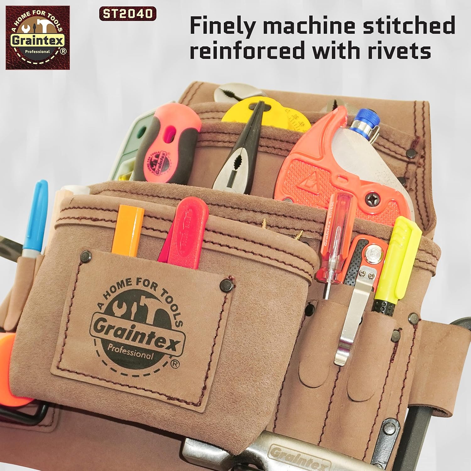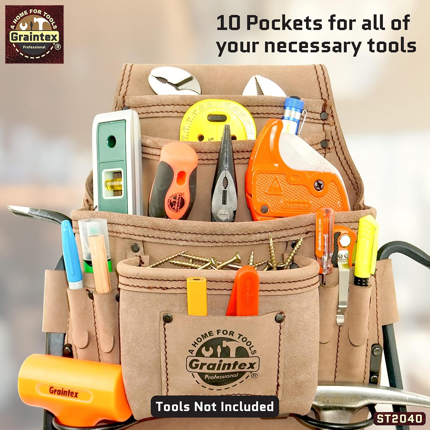 GRAINTEX DISTINCTIVE PRODUCTS are handmade by our highly expert skilled craftsmen using top quality oil tanned leather, giving our customer the satisfaction with our product that can last much longer. The 10 Pocket Nail & Tool Pouch constructed with heavy duty genuine top grain leather that is extra soft and durable. Using the superior leather hides to prepare our exceptional line of top grain series. This specific series is treated with the top-notch quality of chemicals and oils for extra durability and strength. This exquisite tool pouch consists of ten pockets for extra convenience, the tool pouch comes with a 3” wide tunnel slots. Designed with two steel hammer holders following with one large pocket that can hold multiple tools. One medium front pocket that can fit nails, medium-sized tools, two belt level inner pockets, and six small pockets for screwdrivers, pens, pencils, utility knife, and other miniature sets. The pockets are easily accessible, this tool pouch can be used in number of multiple other uses at the workplace or at home. With easily accessible pockets this tool pouch is a handy product for daily use. Accessories include a 3” wide belt tunnel slots for a 2.3/4” belt, two steel hammer holders fitting all standard sized hammers. This tool pouch can be used for multiple projects such as carpentry, housework, gardening, garage projects, electricians, construction, etc. This tool pouch is double stitched and reinforced with steel rivets for extra durability. Since finest heavy-duty genuine top grain leather has been used to manufacture this tool pouch, it will withstand the wear and tear of handy life, while still rustic and elegant in the process. This product will make an excellent gift for friends, family, and loved ones. At Graintex, we are confident that this product will last a long time. It will make a thoughtful, long lasting gift for anyone and everyone. All Graintex products are handmade using the finest materials for durable and long-lasting usage. All our products are comprised with black plated hardware and heavily double stitched at every stress point with reinforced rivets to provide the durability needed in the field. Every one of our products are uniquely originated with heavy duty materials for a sturdy finish for an easier accessibility, extra longevity, and a finer preference. All our products are designed and manufactured by highly professional experienced skilled craftsmen. Graintex Inc. is a family owned company founded in 2005 and has a manufacturing unit in India. Graintex products are professionally designed for use by professionals worldwide…