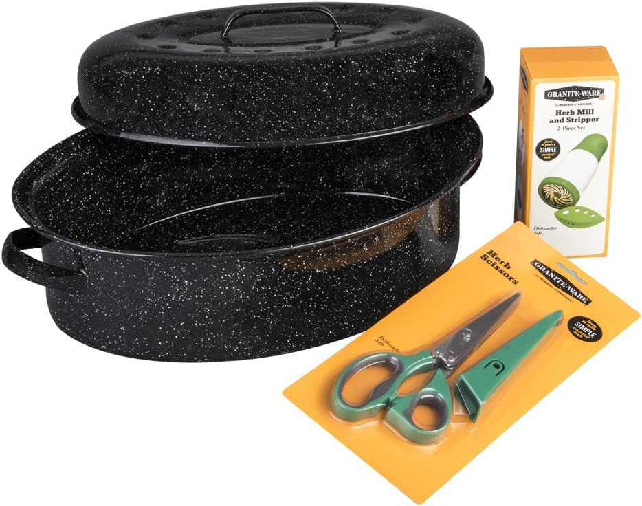 Granite Ware roasters are "America's favorite roaster"! Granite Ware has been a part of the American kitchen For nearly 150 years. It is made in Indiana by a family owned factor and it is the original speckled cookware that has helped generations of families turn holiday feats and everyday meals into cherished memories. Granite Ware is made by fusing porcelain to a steel core at 1500-degree F. The steel core provides strength and even heat distribution while the porcelain surface is inert and naturally nonstick. Porcelain is all natural and will not alter the color, taste or nutritional value of your food. There is no PTFE, PFOA or other unhealthy chemicals in Granite Ware products. The Granite Ware Blue large covered oval roaster fits a 18 lb turkey or poultry. Do not use on glass cooktop but it is safe to use with all other Heat sources. Dishwasher safe. Metal tool safe. Interior dimensions: 15” x 10. 75” x 4”. Exterior Dimensions: 18" X 12. 25" X 4. 25".
