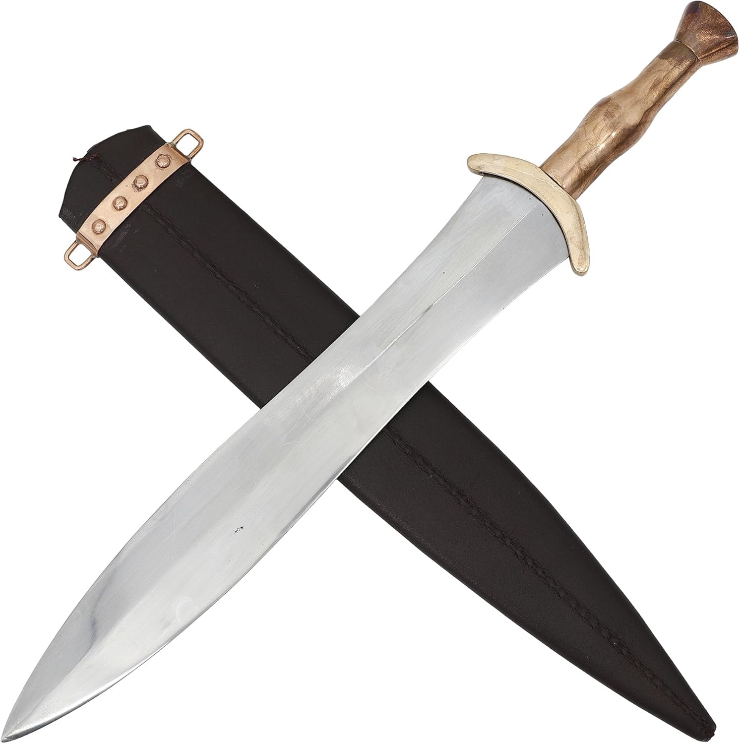 Embrace the legacy of medieval craftsmanship with the Armory Replicas Damascus Carolingian Sword, a masterfully hand-forged weapon inspired by the 8th-century triangle pommel swords of the Carolingian dynasty. Its double-edged Damascus steel blade boasts 176 layers folded up to 350 times, delivering both beauty and strength with an HRC rating of 54–55. The brass guard and pointed triangle pommel enhance its regal design, while the smooth wooden handle ensures comfort and balance. Each piece is uniquely handmade, showcasing authentic tool marks and character. Complete with a handcrafted reddish-brown leather sheath, this sword is perfect for collectors, reenactors, or anyone who appreciates the artistry of historical weaponry.
