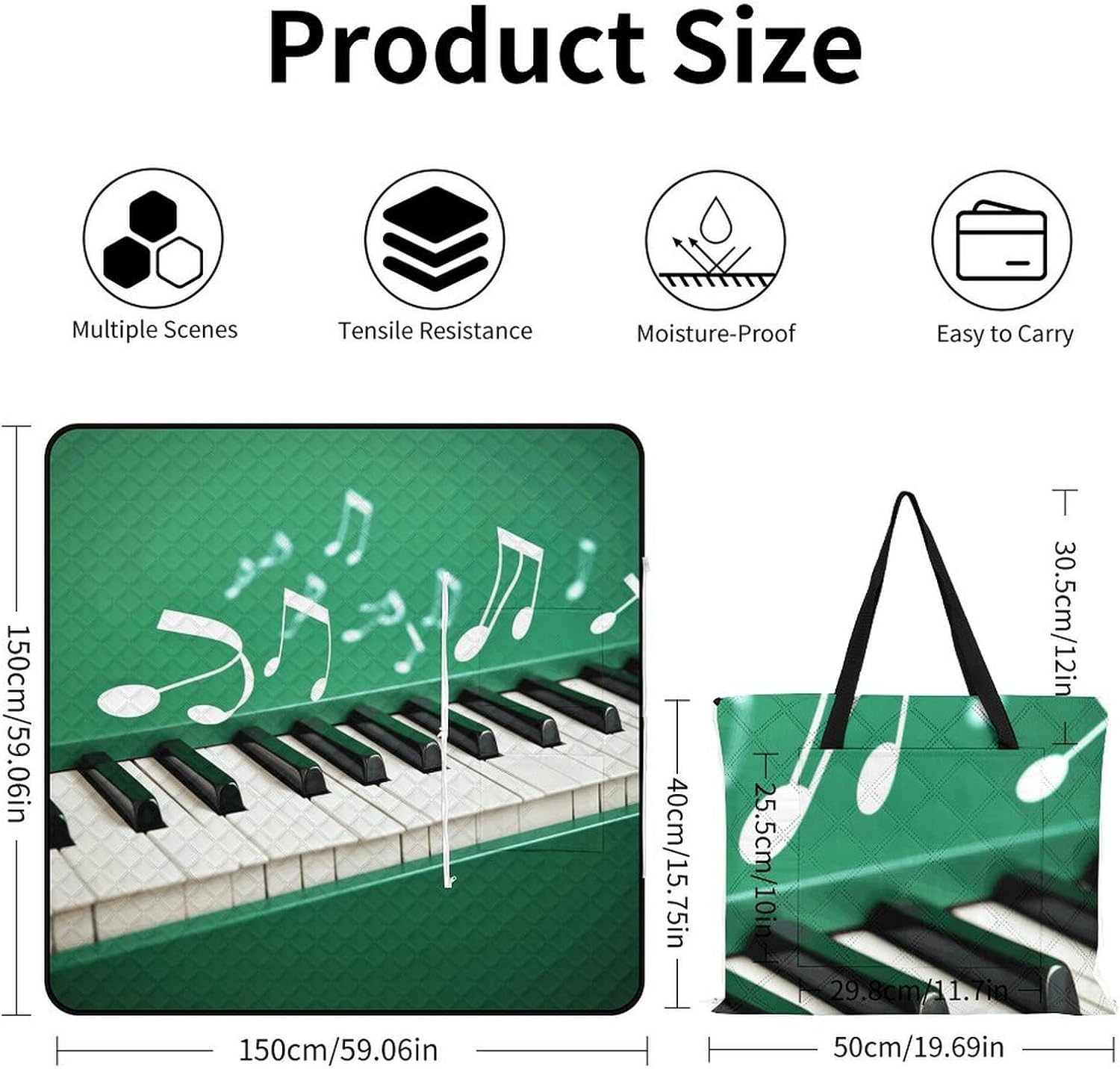 The picnic blanket ,we've only used the highest quality materials, so every picnic is an experience .The underside lining is very sturdy and therefore suitable for every surface. No more worrying about dirty or wet bottoms when you are sitting on damp grass. The Green And White Piano Keys blanket protects you from water, dust and dirt.A large capacity bag and a picnic blanket, 2in1. It has a large capacity and one bag can hold everything you need for going out. You choose the place you want to lie down, and this bag can be turned into a comfortable picnic blanket in seconds also it can fold into tote bag, which is waterproof, sand-proof and wear-resistant.Therefor,you can take it to nearby parks, campuses, beaches or lawn, anywhere you want to lie down.