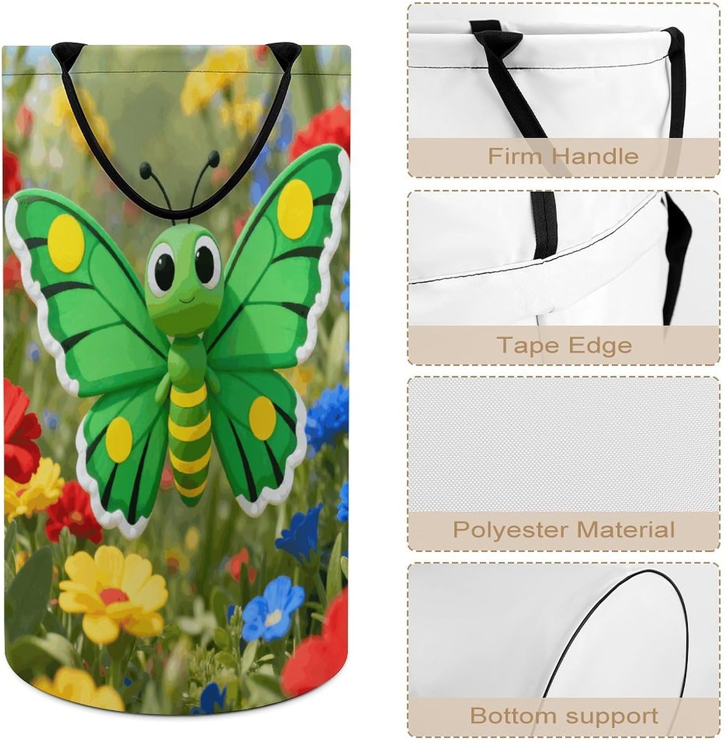 The pattern of the Green Butterfly hamper is printed with exquisite patterns, which makes the product more attractive.Chic design allows it to be used in the living room to hold throw blanket, pillows, and reading materials, as well as in the bathroom for towels, or as a laundry hamper.The laundry hamper adopted collapsible design, equipped with handles. It is lightweight and portable for using, storing, and moving conveniently.Green Butterfly Clothes hamper is suitable to store dirty clothes washing, place in the room to store toys, and other household goods, keep the house clean and tidy. Perfect laundry hamper for home, office, closet organizer, bedroom, bathroom, college dorm, etc.Gets out of your way when you need it to. This storage basket or laundry hamper is a good gift, which not only meets everyday storage needs but also carries deep care and love, a perfect way to turn thoughtfulness into warmth.