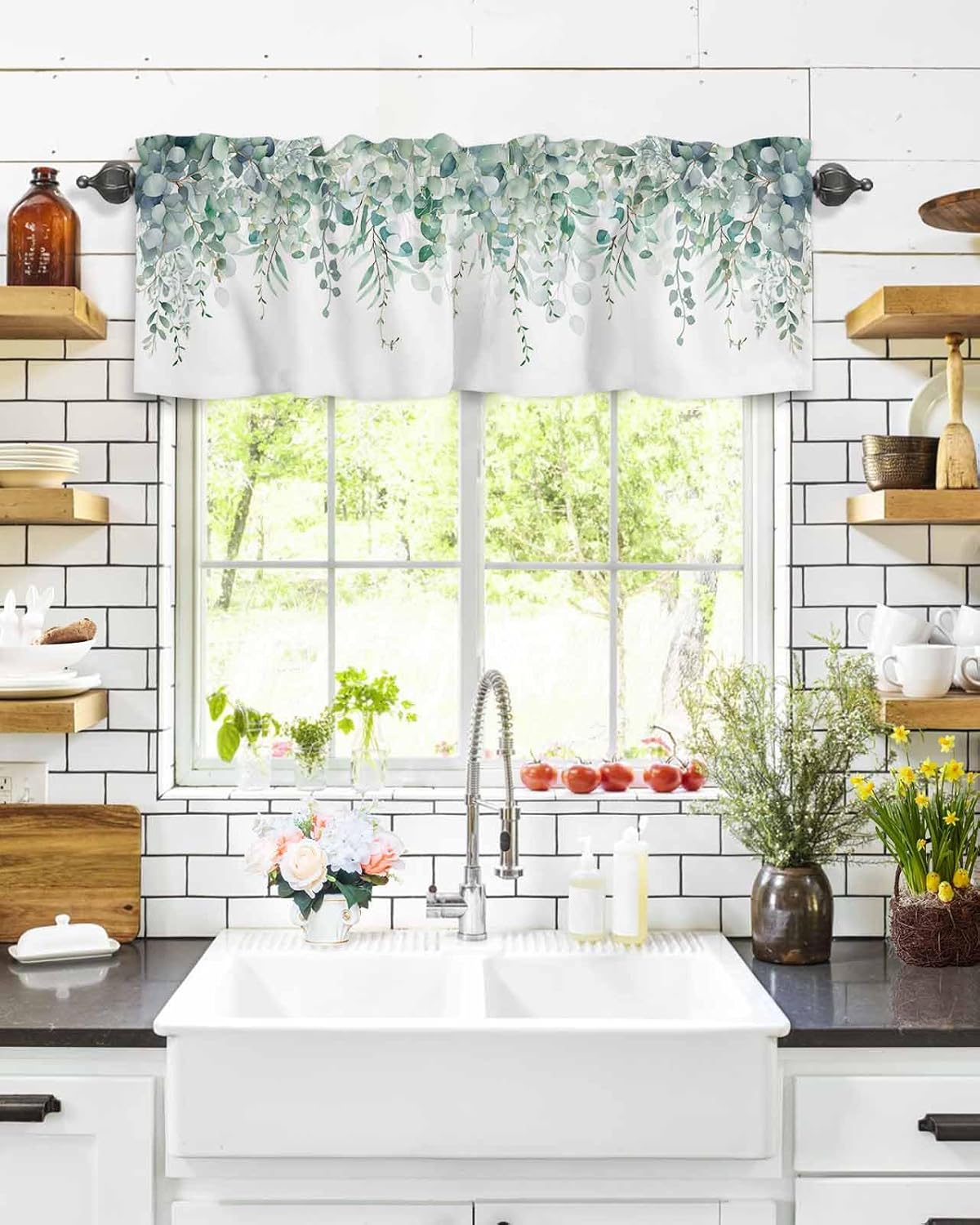 Green Eucalyptus Swag Curtain Valance for Windows,Watercolor Leaves Window Treatments Short Swag Topper for Kitchen Windows Bathroom Bedroom,28 x 36 Inch