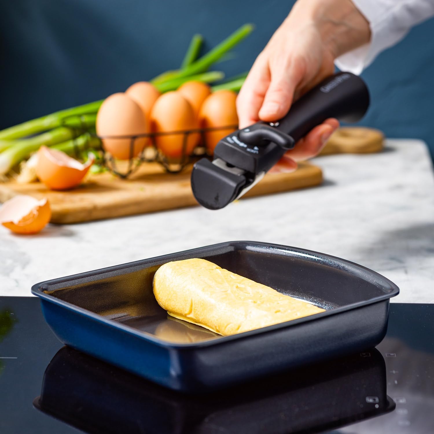 Single Green Pan Click Chef Series Egg Pan with Removable Handle The ceramic coating allows heat to be transferred quickly and evenly, creating a delicious finish for your food. It also has excellent non-stick effect, non-stick and easy to clean. The simple design makes it easy to fit on your dining table, so it is recommended that you remove the special handle after cooking. Product size: 8.6 x 6.7 x 1.7 inches (217 x 170 x 42Product Weight: 14.2 oz (420 g). Country of Origin: China. Material: Aluminum alloy; Surface treatment (inner and exterior): Ceramic coating. Notes Use the removable (removable) handle for click chefs (sold separately). Install the handle on the curved side of the body.