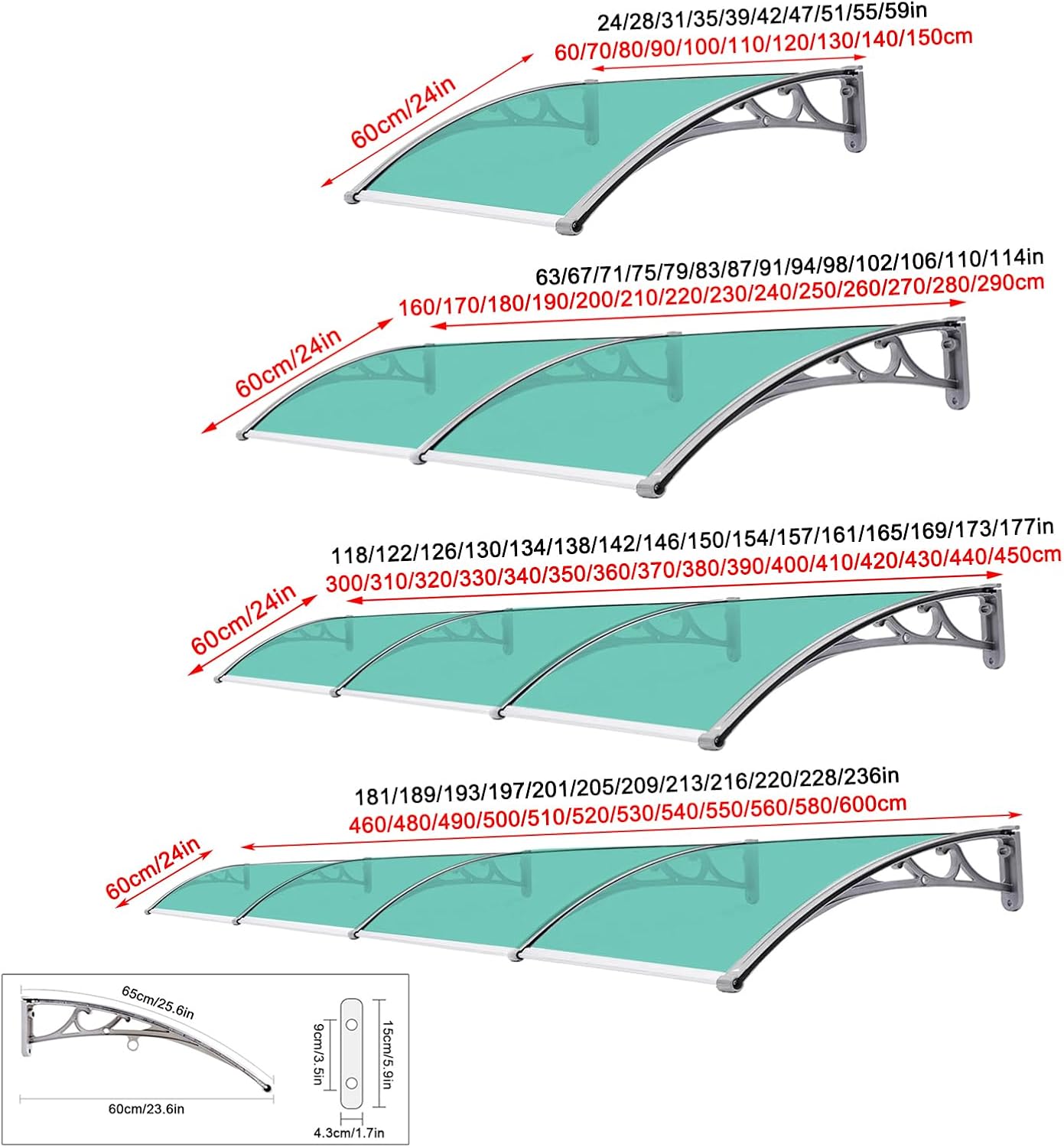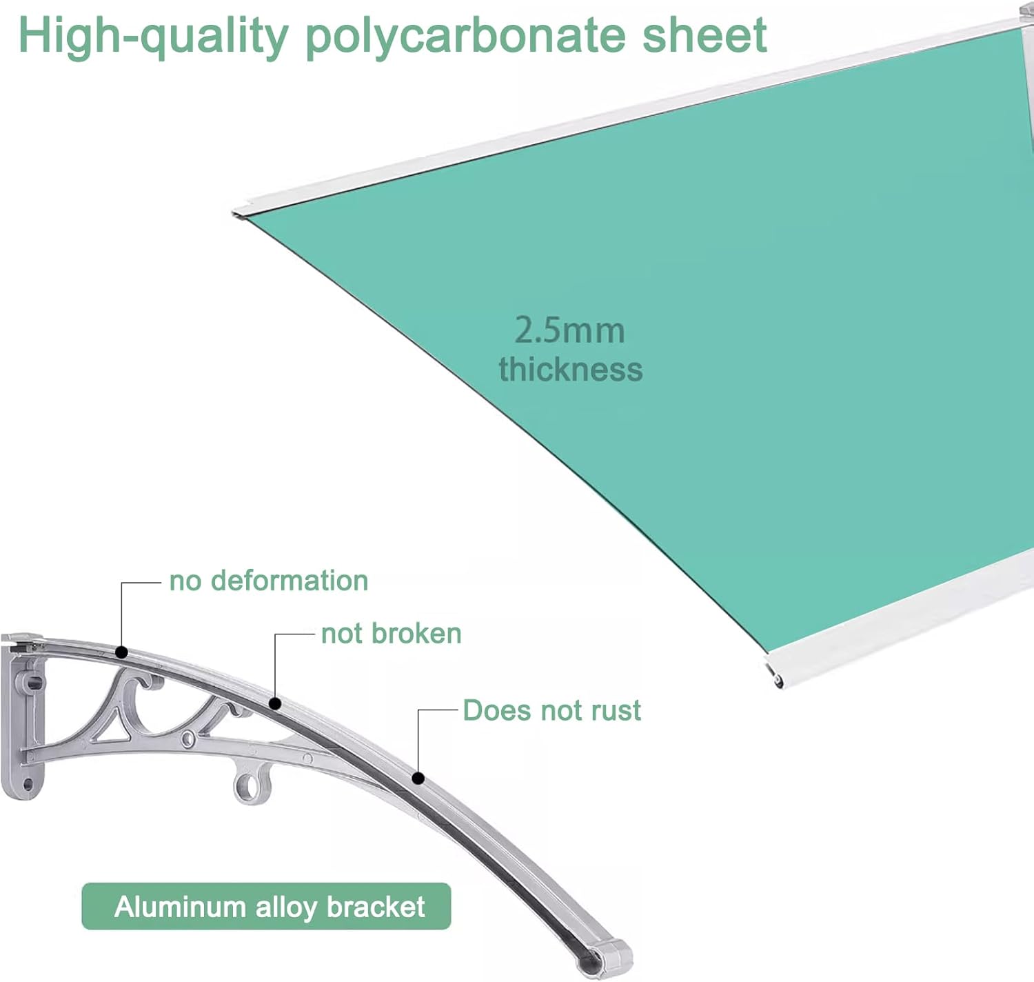 A unique and stylish green door canopy that will enhance the exterior appeal of your home at less cost. Add value and utility to your existing outdoor area. Get ready for compliments from neighbors and friends. The front door canopy is built to withstand all weather, and high-strength aluminum brackets provide extra stability and security. Suitable for your home and outdoor long-term use. The door canopy provides you enough protection. Also great for sheltering outdoor equipment, bikes, mailboxes, packages and more. This modern canopy will create great comfort for you. Don't miss such a great opportunity! Name: door canopy Material: Polycarbonate Bracket material: aluminum alloy bracket Color: green board + white bracket Thickness: 2.5mm Bearing capacity: 200KG/441 lbs Dimensions: Width (Protrusion) x Length (Against Wall) Width: 60cm/24in, 80cm/31in, 100cm/39in, 120cm/47in Installation method: vertical installation Package includes: 1x door canopy (according to the number of panels)+bracket+all accessories 2. Other accessories include: sealing strips, expansion screws, self-tapping screws, front/rear aluminum strips. Please measure your window or door first and you can decide which combination suits your needs. For customization, please contact us.