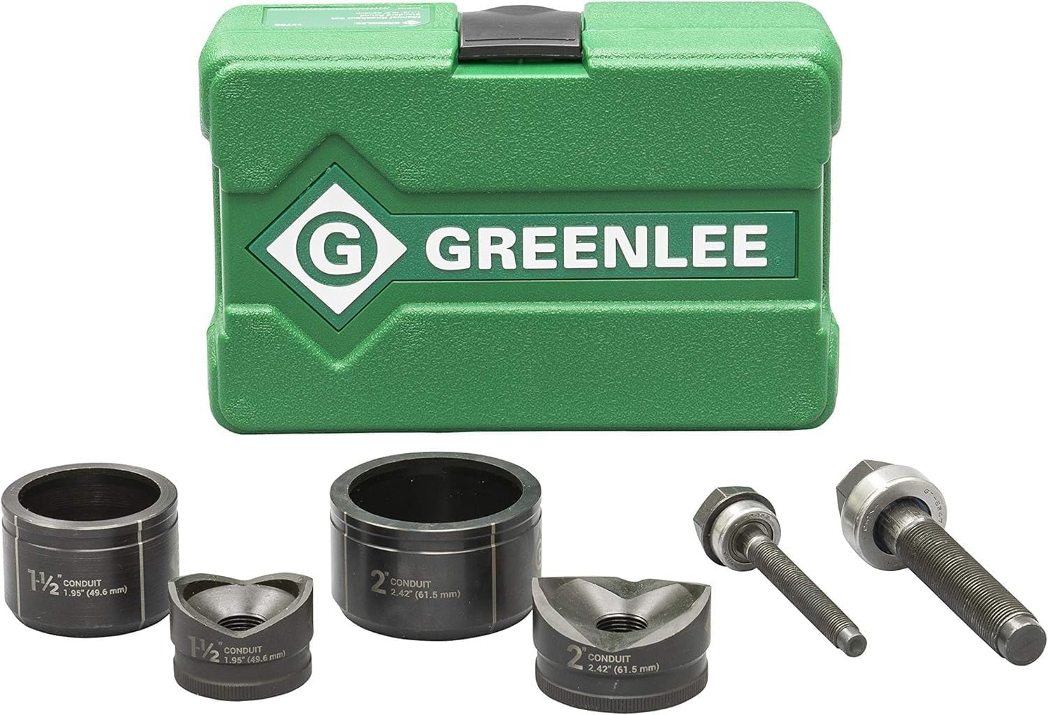 Product Description Standard round 1-1/2 - 2 manual Knockout set. Greenlee slug-busters can be used on mild steel up through 10 gauge (3. 5 mm). application: punch mild steel, aluminum, fiberglass and plastic. Operates with battery, hydraulic, KRW-1 high leverage ratchet or manual drivers. From the Manufacturer Greenlee round standard metal punch units are complete units consisting of punch, die and draw stud. They can punch quick clean holes through metal up to 10 gauge (check specs for specific punches). They can be used with battery-powered, hydraulic, ratchet or manual drivers. Properly assembled through pilot holes, they will make clean, fast and accurate holes. After cutting the slug falls free in the die, and a quick tip drops it out. Kit includes punches and dies for 1-1/2 and 2-Inch conduit. Also includes 1 draw studs and a plastic case.