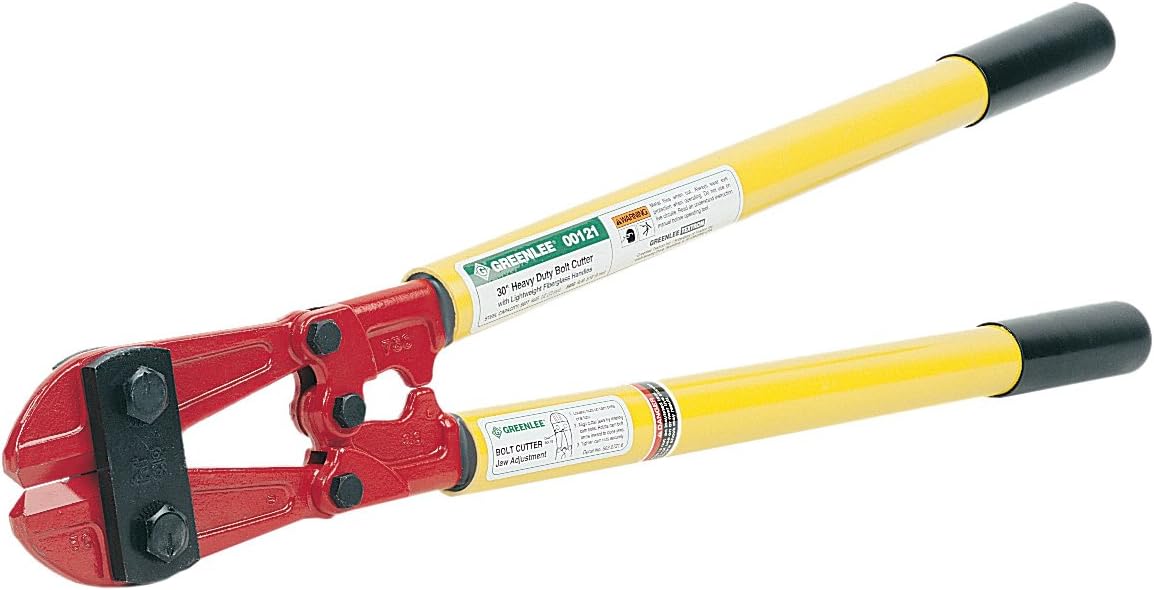 Product Description Heavy duty type; 18 inch overall length; forged process; 3.4 pound weight; fiberglass handle material; 5/16 inch up to 85 Rib, 7/32 inch up to 40 RC cutting capacity; steel jaw material; 85 Rib, 40 RC cut material hardness; handle type rubber grip From the Manufacturer Greenlee's heavy duty bolt cutters have a unique cam bolt blade adjustment for easy cutter alignment. Forged steel blades for long life. Clevis-mounted blades for greater strength. Custom rubber grips for maximum power. Fiberglass handles are tough and lightweight.