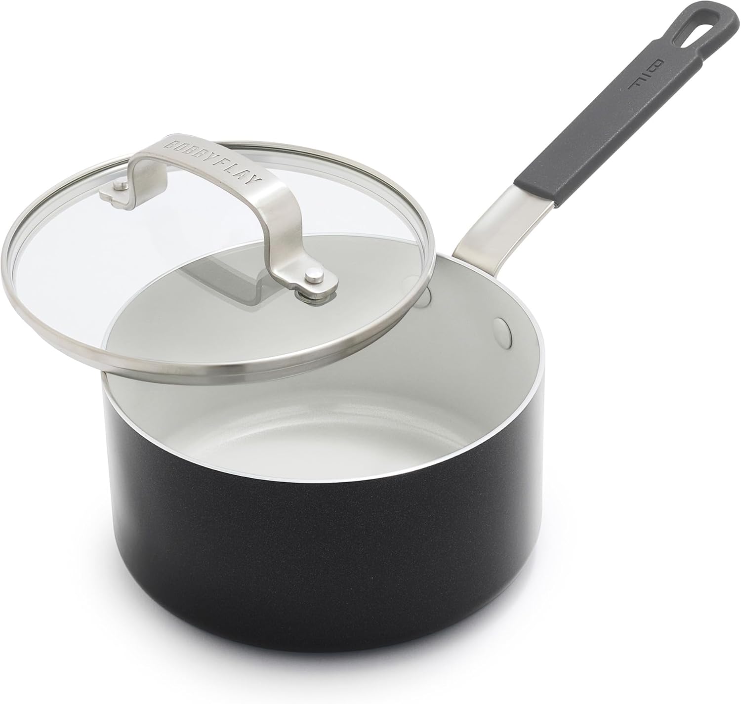 World-renowned chef, TV host, restaurateur, and author Bobby Flay partnered with GreenPan to bring years of expertise and cooking innovation to this cutting-edge collection. Crafted from quick-heating aluminum, this pan lets you dial in the right temp so you can master your meals. This saucepan features GreenPan’s signature diamond-infused ceramic nonstick coating to deliver years of powerful PFAS-free performance. The toxin-free coating is free of PFAS, PFOA, lead, and cadmium for remarkable worry-free performance. This saucepan is packed with helpful details and GreenPan’s groundbreaking cooking technology. The generous chef handle stays cool to keep cooking comfortable so you can focus on flavor. Plus, the chip-free edges help prevent chips and dings to the coating for long-lasting performance and added durability. The tempered glass lid lets you keep an eye on your meal as you cook while the wide handle makes it safe and easy to remove. Designed to deliver in any kitchen, this saucepan is optimized for performance on all stovetops, including induction. It’s also oven safe up to 392˚F and dishwasher safe for effortless cleanup.