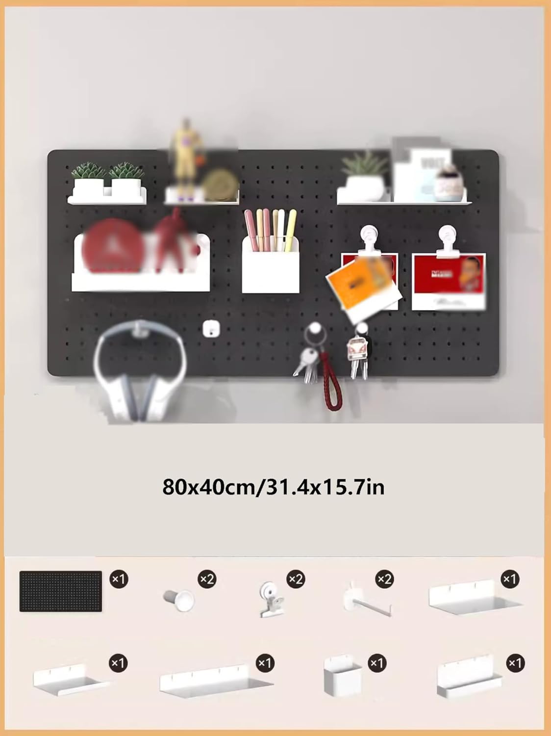 Pegboard Wall Mounted Display Heavy Duty Metal Pegboard Accessories Tool Storage Kit + Brackets and Hooks for Home and Work Area Our universal pegboard helps keep items organized and in place, reducing clutter on your desk, maximizing storage capacity and making it easier to find what you need, when you need it. Great choice for storing and storing accessories at home or at work. Specification: product specification Product Name: Pegboard Tool Organizer/Pegboard Wall Organizer/Pegboard material: metal Package Contents: 1x pegboard and its accessories The package only includes the shelf and its accessories, not the decorations in the picture, thank you for your understanding! installation method: 1. No damage to the wall, we provide self-adhesive pegboard mounting bracket, no need to drill holes in the wall. 2. Drilling installation method: We provide a screw and washer installation kit, which can be installed on the wall with an electric drill to make it more firm. notes: Due to manual measurement, there may be slight errors in size. Colors may vary slightly due to different screen displays. Please keep them away from children to avoid potential risks.