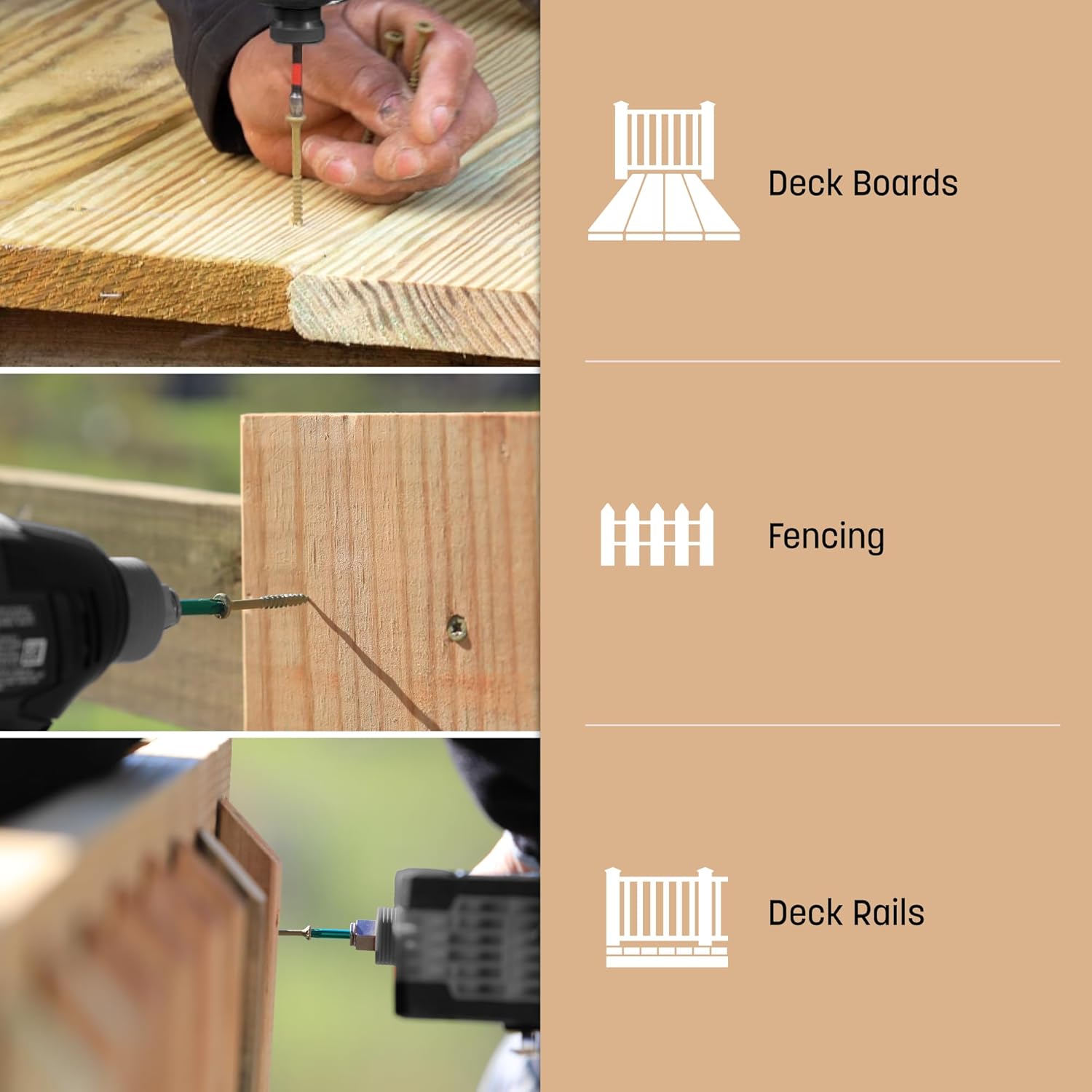 GRK's Deck Elite wood screws are corrosion-resistant and designed to use in wood decking boards. Screw provides a quick drive and clean finish in top boards. The 400-count package provides coverage of 100 square feet (assuming 16 in. spacing but may vary based on deck's configuration).
