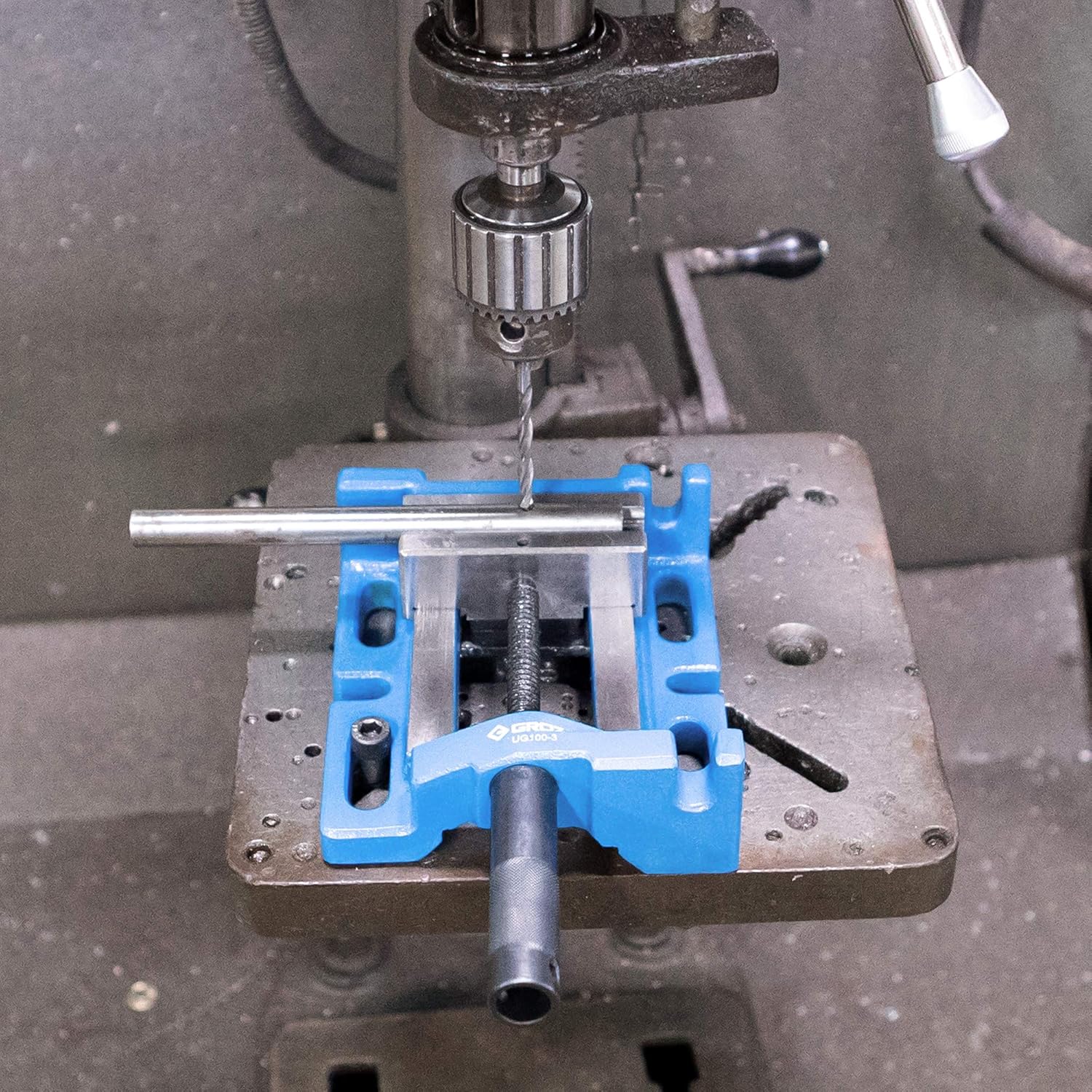 GROZ 35125 4-Inch 3-Way Uni-Grip Drill Press Vise. Unique design allows the vise to be used on the side and front face, in addition to the base. Conveniently holds long, oversize, and irregular objects. Manufactured from graded cast iron. Has a precision ground base and vise bed for smooth lateral movement of the movable jaw. Fixed jaw with 3 longitudinal and 1 transversal prism for firm gripping of round stock both horizontally and vertically. Special seat in jaws facilitates retaining of flat workpieces. The spindle moves inside the hollow hand grip making the vise usable on any position across the table. Elongated clamping slots for rapid change of the vise on the work table help save time. Low profile and compact. Suitable for use with drill stands, bench drills, and drill presses. Great for metal and woodworking applications. GROZ is ISO 9001 Quality System Standard compliant.