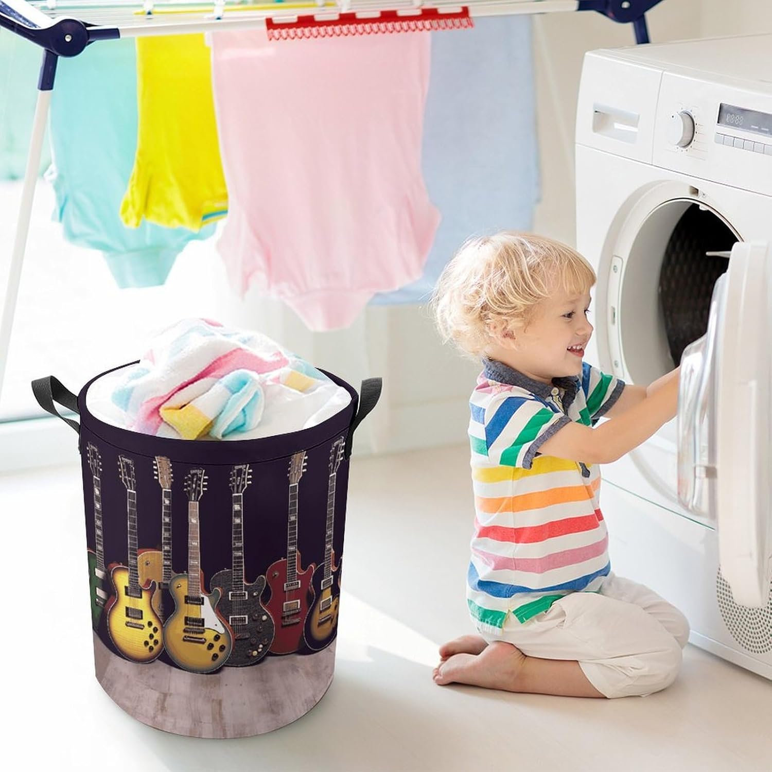 This large collapsible laundry basket is here to transform your home organization. Made from smooth Oxford cloth with a water-resistant coating, it handles damp towels and soiled clothes without absorbing moisture or retaining odors. The drawstring closure adds an extra layer of protection, keeping your items clean and dust-free whether it’s placed in your walk-in closet or a hotel bathroom. When you’re done, it folds down to a slim profile that fits easily in a storage bin or under the bed, making it perfect for small apartments, campervans, and vacation rentals.This cute laundry hamper blends functionality with a playful, stylish design that complements any decor. Measuring 13.8 inches in diameter and 17.3 inches in height, it has plenty of room for a family’s daily laundry, while its lightweight build means you can carry it with one hand thanks to the sturdy side handles. Whether you’re tossing in workout gear after the gym, stowing away extra blankets for guests, or packing it for a weekend trip, it adapts to your needs effortlessly.For anyone who loves to explore, this travel laundry bag is a game-changer. No more mixing dirty clothes with clean ones in your suitcase—simply toss your used garments into this bag, cinch the drawstring, and keep your luggage organized. Its foldable design means it takes up virtually no space when empty, so you can tuck it into a backpack or carry-on without adding bulk.Whether you’re staying in a hotel, camping in a campervan, or settling into a vacation rental, this bag keeps your belongings neat and tidy, making every trip stress-free.