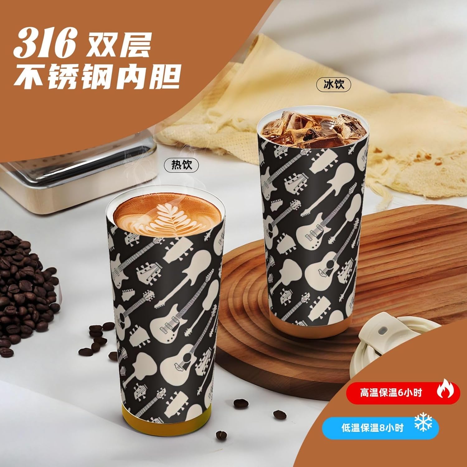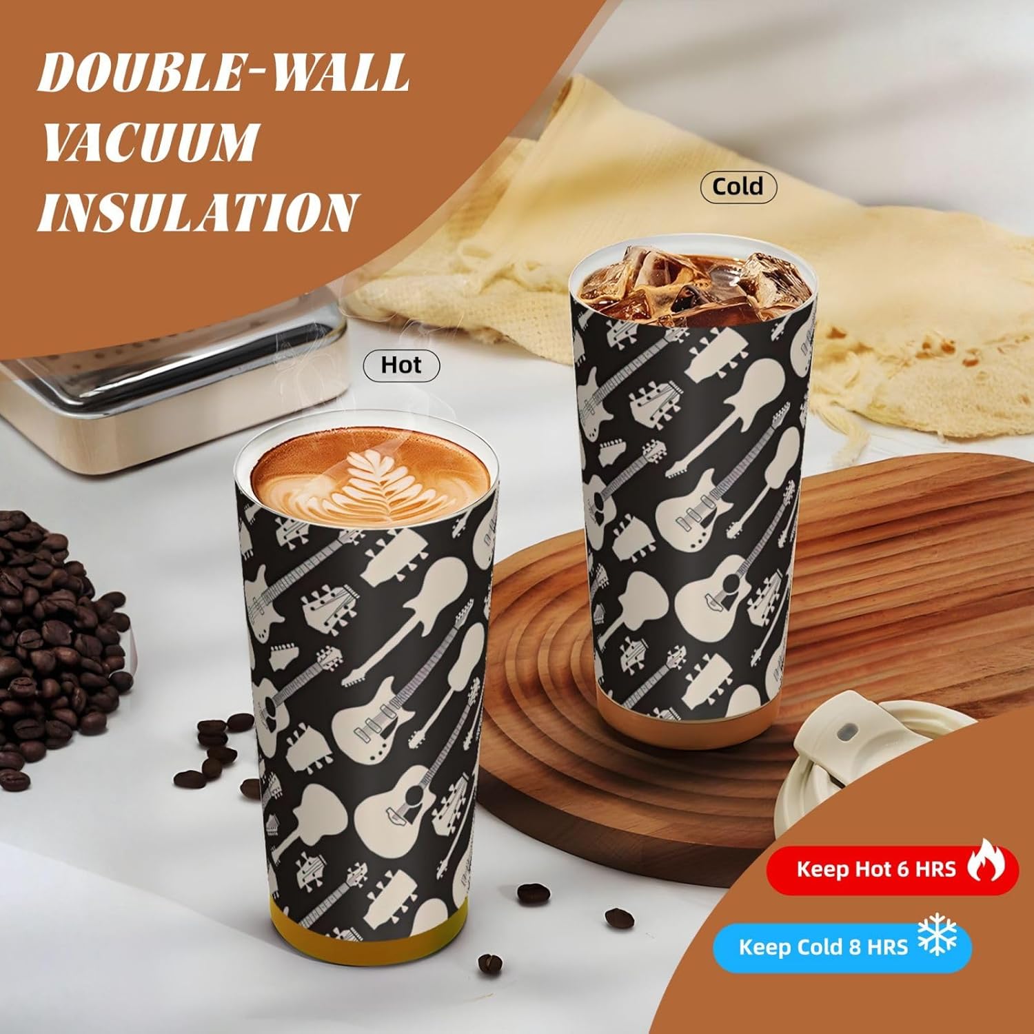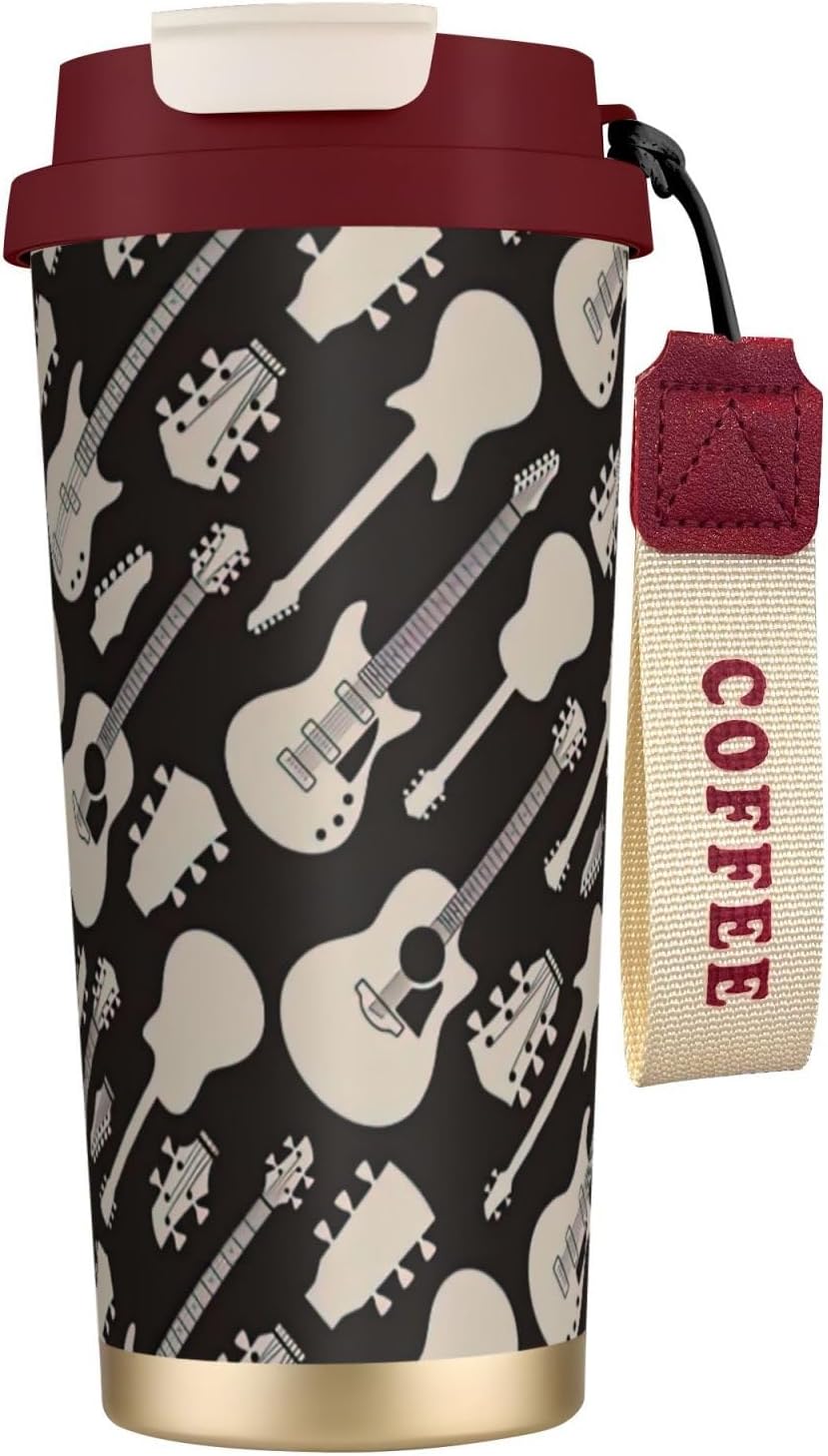 This Guitar pattern Print travel Coffee Mug supports three drinking modes: the direct drink spout for quick drinks during commutes, the straw port for iced coffee and other spill prone beverages, and the open top design that replicates the traditional coffee cup experience. BPA Free 316 Stainless Steel, Safe and Durable Inner liner made of food grade 316 stainless steel, non toxic, odorless, BPA free, safe for long term use.