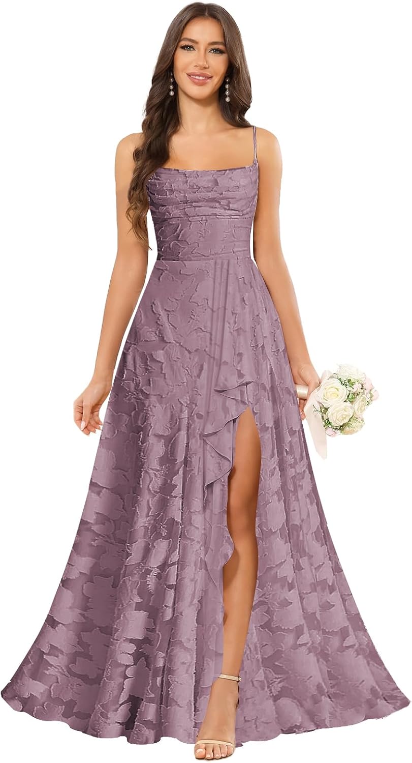 | Embellishment Feature | a line, jacquard chiffon, ruffles chiffon, spaghetti straps, with high slit |