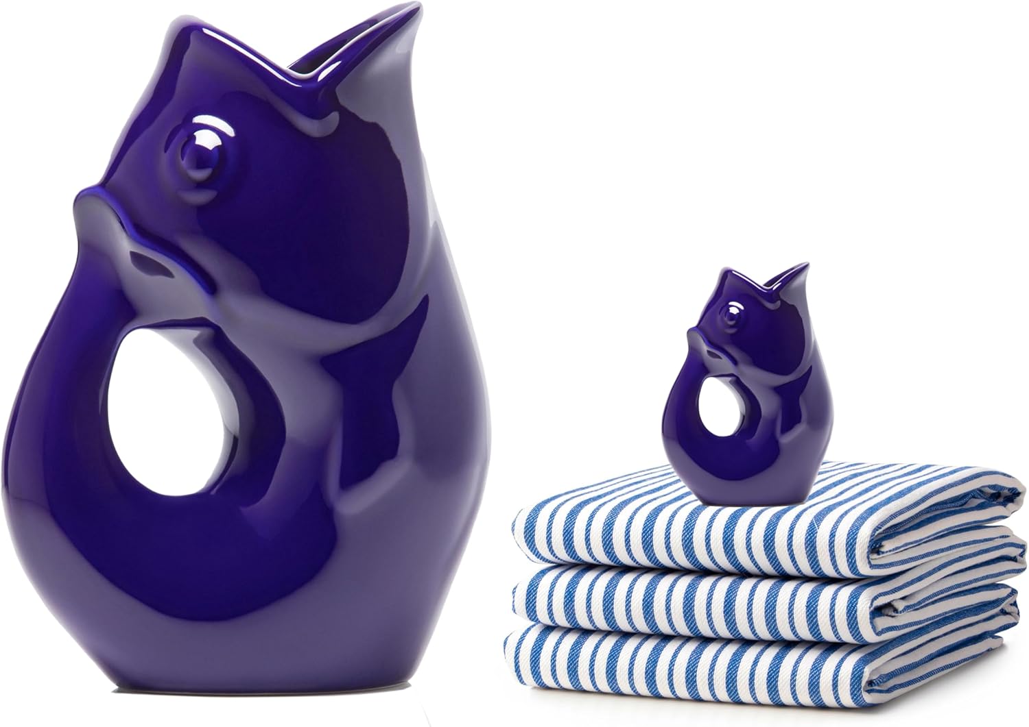 Experience the delightful charm of our stoneware pitcher, designed to produce a whimsical gurgling sound with every pour. Expertly crafted from durable stoneware, this unique piece combines both style and functionality. With a generous capacity of 42 oz. and a companion mini size of 3 oz., it is perfect for serving beverages or displaying fresh-cut flowers. Its dimensions are 9.5"H x 4"W x 6.75"L for the larger pitcher and 3.75" x 2.75" x 1.5" for the smaller version, offering versatility for various uses. This pitcher makes a thoughtful and distinctive gift for any occasion. Plus, it's dishwasher-safe, ensuring easy cleaning and maintenance. Add a touch of whimsy and practicality to your home or gift list with this charming piece! - Produces whimsical gurgling sound. - Crafted of durable stoneware. - Capacity 42 oz. & 3 oz. - Size 9.5"H, 4"W, 6.75"L & 3.75” x 2.75” x 1.5 - Perfectly versatile for fresh cut flowers. - Makes a great gift - Dishwasher safe Generousely sized flowersack kitchen towels - 100% Loomed woven lint free cotton - Hanging Loop for Easy Hanging - Color: Sunflower Hem - Hemmed on all 4 sides - Dimensions: 30.5”L, 20.5”W - Set of three - Great addition to a housewarming gift CARE INSTRUCTIONS - Machine Wash Cold - Do not dry clean - Do not bleach - Tumble dry low