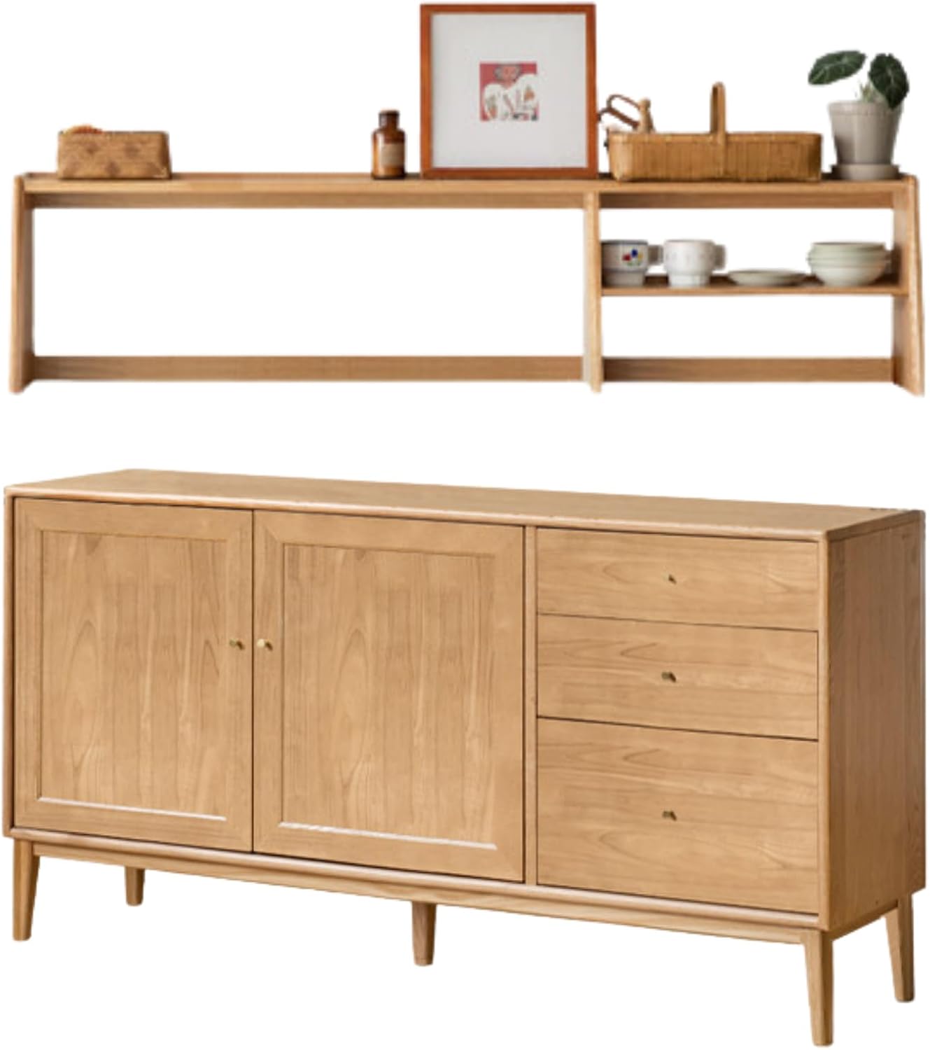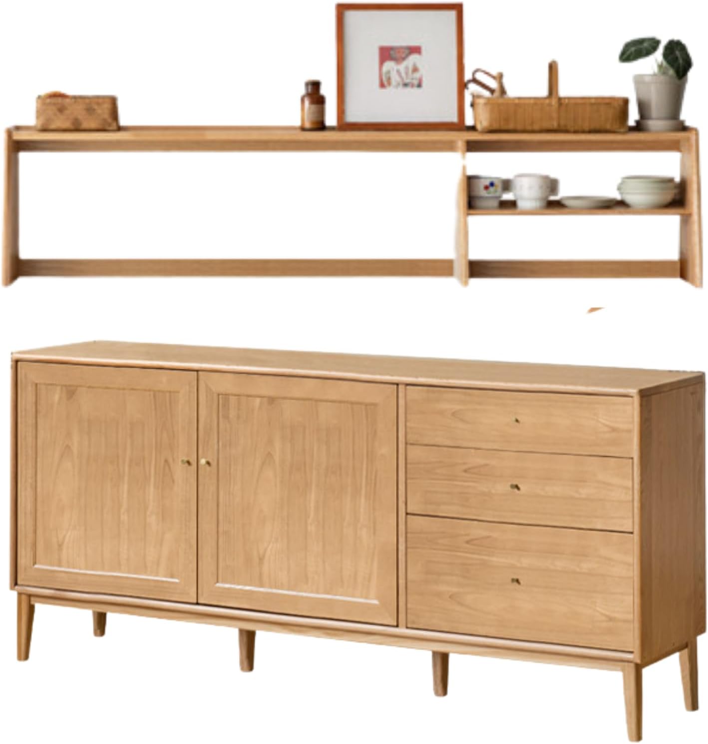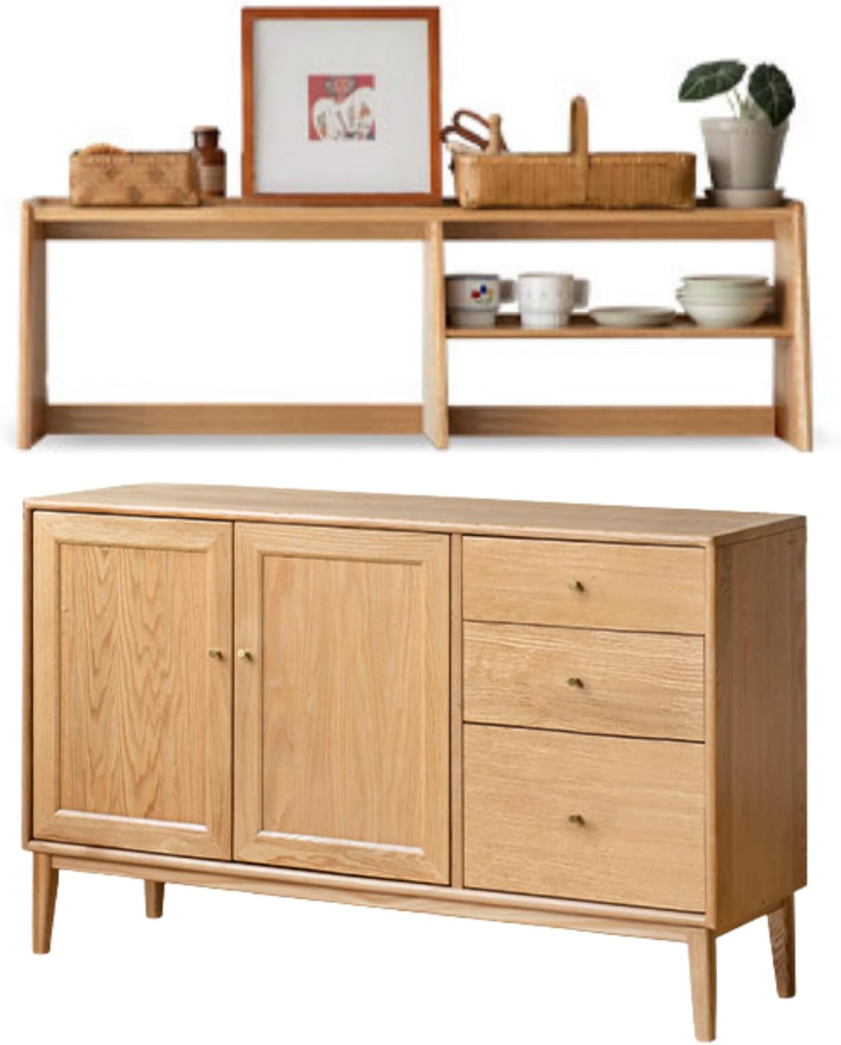 A simple, practical, versatile, solid wood double-door sideboard B Classic and simple shape, very attractive Three drawers + two doors, storage capacity Max North American FAS grade oak, durable and full of texture Dining room/living room, easy to use anywhere Take you to experience different storage aesthetics1. The entire product is made of 100% solid wood, without any artificial boards, veneers, or finger-jointed boards. It is genuine and of high quality.2. The main material is imported North American FAS grade oak, with beautiful grain, few knots, and no mold.3.The main material is Thai rubberwood, using finger-jointing technology, which facilitates even stress release and reduces the likelihood of deformation, expansion, contraction, and cracking. 4. Auxiliary material: paulownia wood, used for drawer inner panels and back panels. It is corrosion-resistant, wear-resistant, high-temperature resistant, does not deform, and is not prone to mold. It has been the material for bellows handles since ancient times and is also a famous wood for making musical instruments in ancient China.It uses odorless paint and an open-pore spraying process. After four coats and natural drying, the oak grain and texture are preserved to a greater extent, making it natural and environmentally friendly.