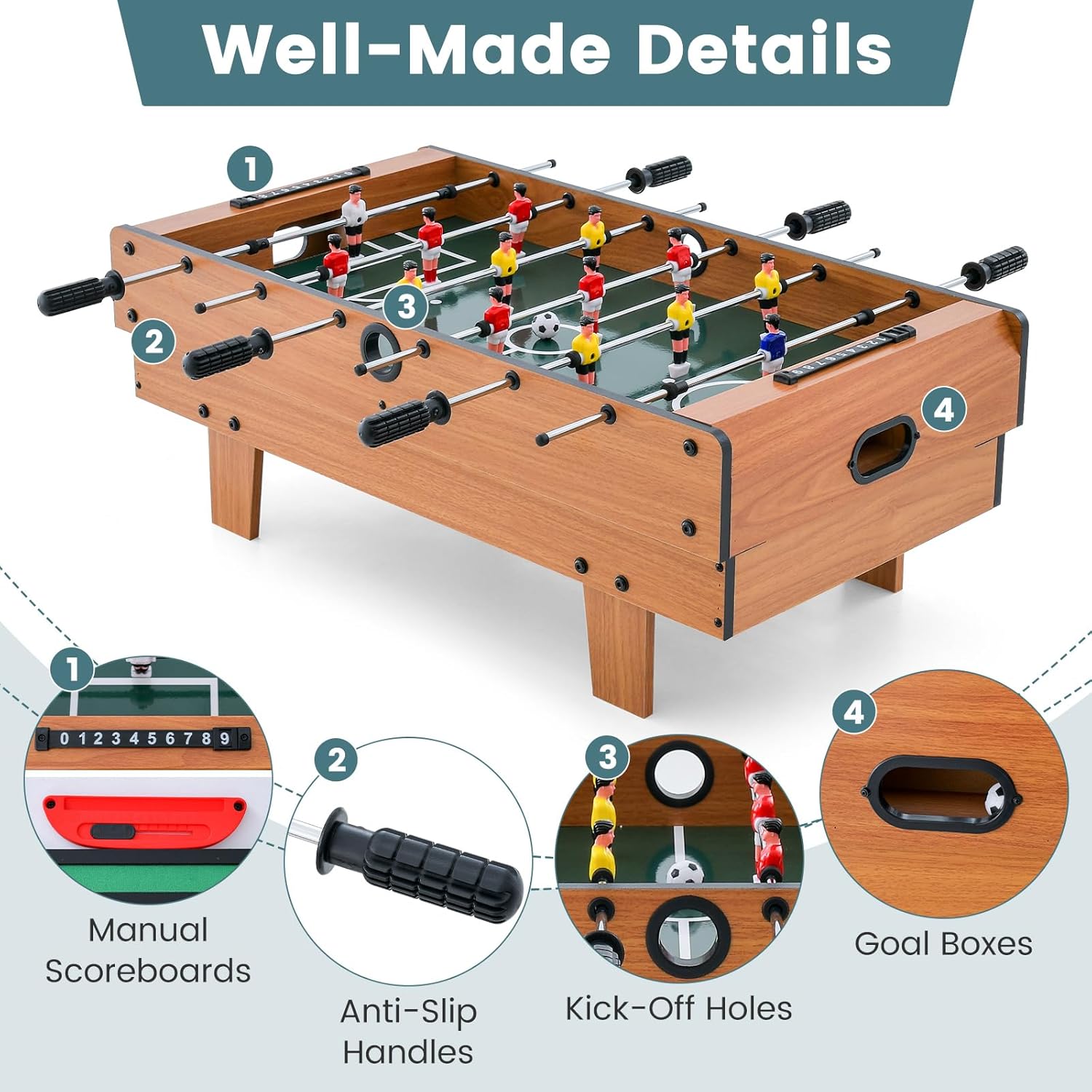 Description:Enjoy endless fun with this 4-in-1 multi game table set.Featuring foosball, billiard, table tennis, and hockey games, this game table provides various fun for all ages. The stackable tabletop design allows for easy transitions between games, saving space and time. With manual scoreboards, kick-off holes, smooth metal rods, and anti-slip handles, you will experience smooth gameplay and precise control. This compact table is versatile for tabletop or floor play, making it perfect for various settings. Complete with all accessories needed for each game, this multi game table set is ideal for home, game room, office, dorm, parties, and more. Features:Foosball, billiard, ping pong, and hockey games in one tableStackable design for saving spaceEasy to switch between different gamesConvenient game monitoring with the manual scoreboardsCrafted with well-made details for durability Comes with complete accessories for each gamePlay on the table or on the floorSuitable for kids, teenagers, and adultsBrings endless fun to your family nights or friends gatheringsSpecifications:Color: NaturalMaterial: MDF + PP + MetalOverall Dimension: 32" x 17" x 12" (L x W x H) Net Weight: 21 lbsPackage Includes:1 x Combo Game Table Set1 x User Guide