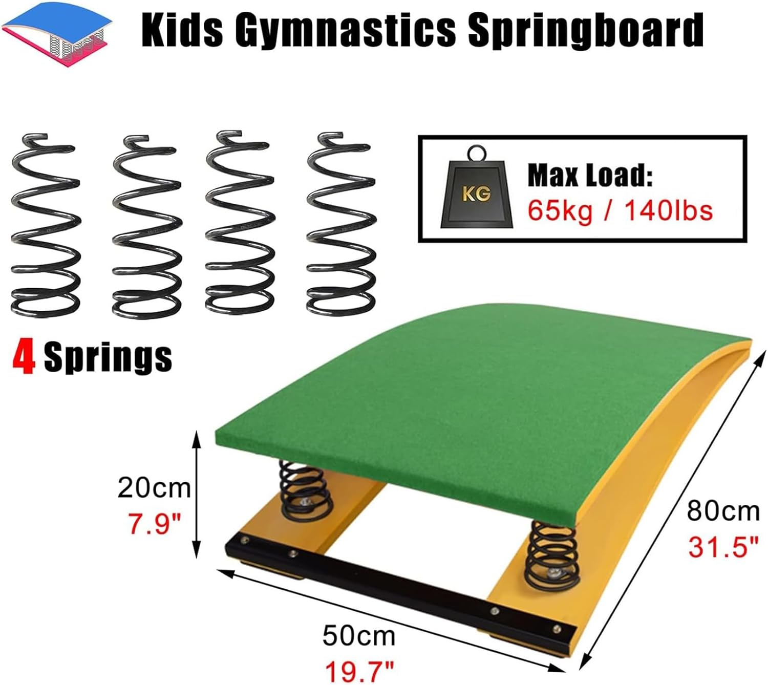 - Color: Vibrant Green- Material: Solid Wood- Load Capacity: 65kg / 140lbsKey Features:- Preassembled for immediate use.- Built for safety and durability.- Includes commercial-grade tilting pads, ideal for both gymnastics studios and home practice.- The padded, non-slip carpet top provides a secure grip and exceptional comfort during training.- Our meticulous edge stitching process enhances durability, preventing tears even under rigorous use.- An essential tool for mastering dismounts, perfecting horizontal bar techniques, athletic training, skill practice, and tackling obstacle courses.What's Included:- 1 x Gymnastics SpringboardImportant Notes:- Manual measurements may lead to slight discrepancies of 1-2 cm. Please refer to actual product dimensions (1cm = 0.39 inch).- Color variations may occur due to differences in computer resolutions; the actual product may differ from images.Efficient Customer Support:For any inquiries, our dedicated customer service team is readily available via email. Expect a response within 24 hours.