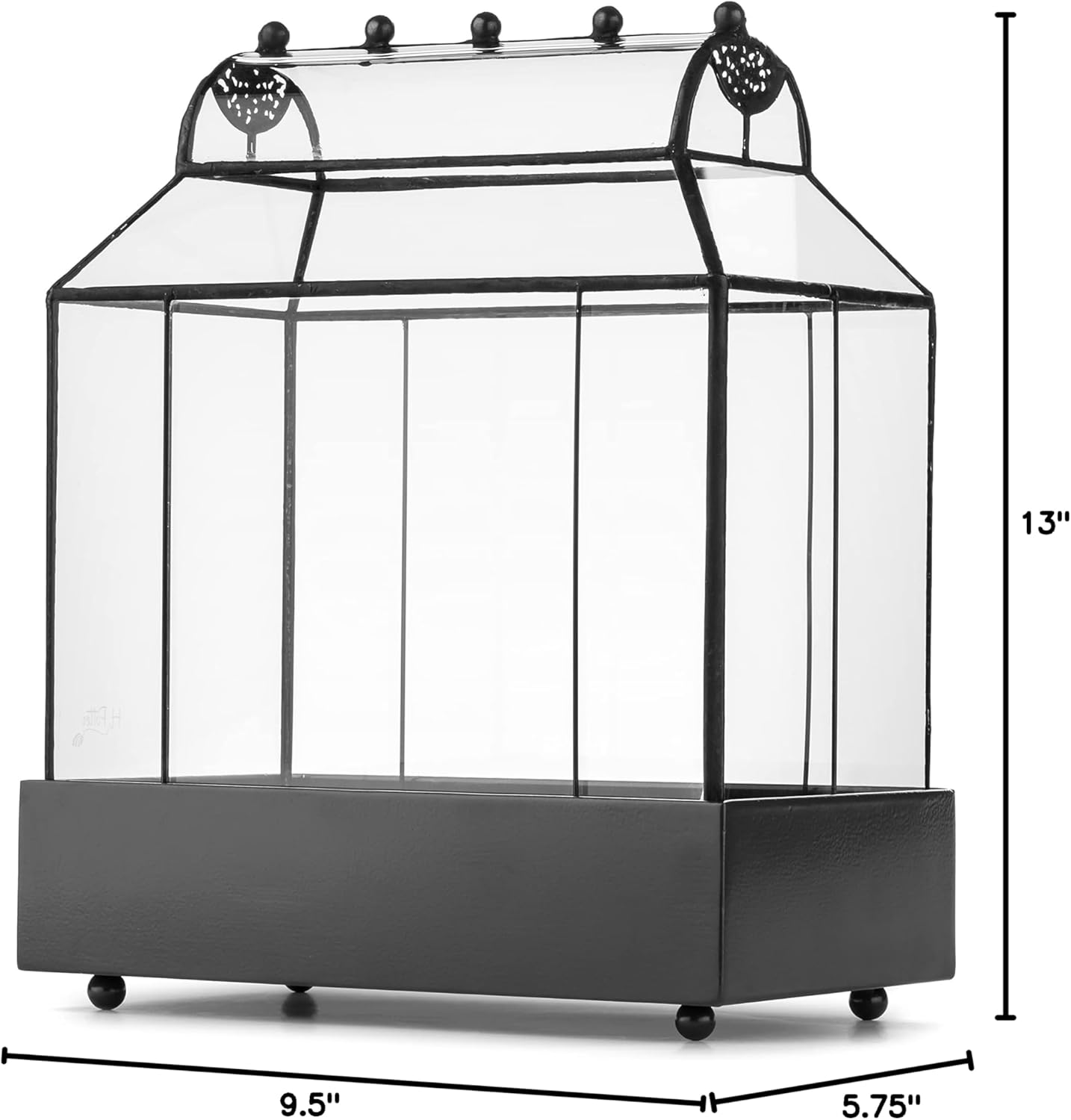 Approximate Dimensions: 9.5 inches side to side by 5.75 inches back to front by 11.5 inches tall. Glass terrarium is the perfect size for the office desk or a apartment. Makes a fantastic gift. Planting your terrarium: Start with a layer of pebbles and mix in a handful of charcoal chips, spread this mixture evenly on the bottom of your tray. Next add a layer of soil to nearly fill your tray. Make small holes where you wish to insert your plants. If your plant has a root ball larger than the depth of your tray gently tease out the roots horizontally. Once you insert your plants into the little holes, bury the roots and tamp the soil to help remove air pockets. Add live moss. Water very lightly as your terrarium will be recycling its own water and you don’t want waterlogged soil. Place the glass top on your terrarium, sit back and relax. What you place inside your terrarium is entirely a matter of personal taste. Do you prefer a green oasis? Do you enjoy the mystic of a fairy garden? Or perhaps exotic orchids are your fancy? The choices are endless. Your imagination is the only limit.