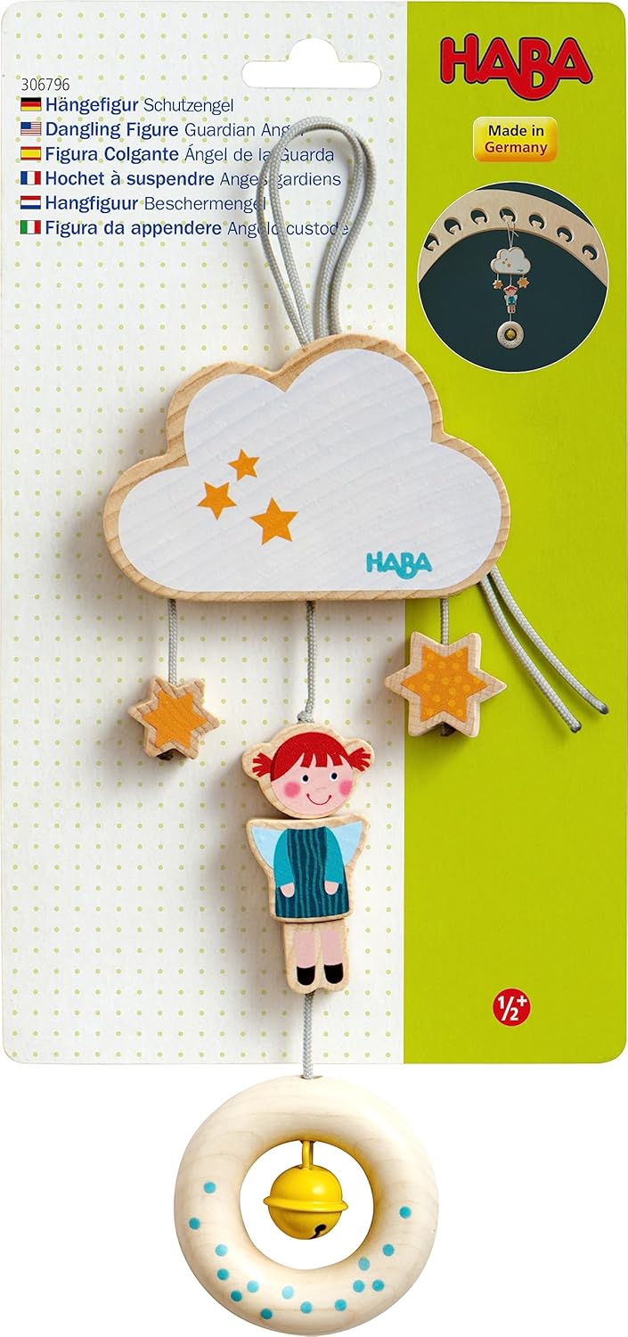 The pretty hanging figure guardian angel from HABA invites babies from 6 months to play. A cute angel flutters between cloud, stars and gripping ring. With a cheerful smile, it challenges little ones to grab and discover. Horch! The yellow bell rings when the active pendant moves. With the robust cord, the small wooden furniture is quickly attached to the play arch, pram, cot and baby seat. The movable wooden elements promote perception, motor skills and first grip. At home and on the go, the HABA hanging figure provides the best entertainment. Lovingly designed, the baby toy for hanging is great as a gift for birth and christening.