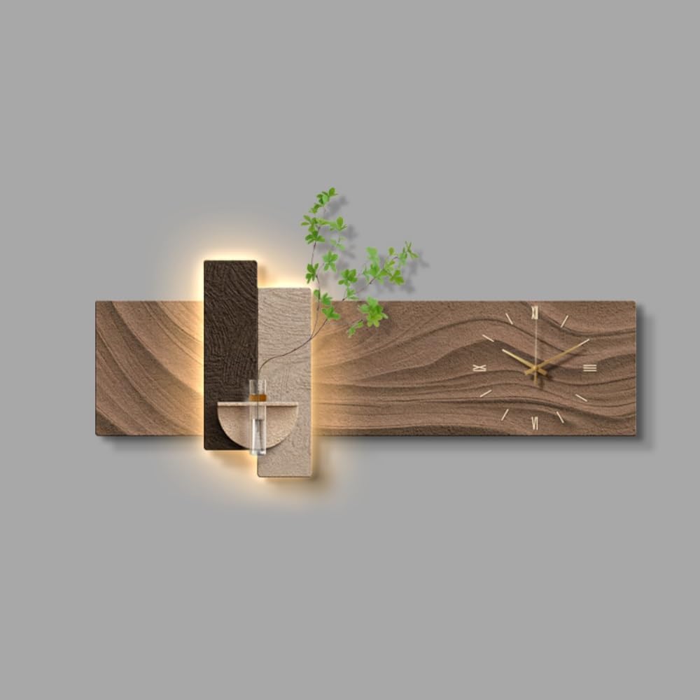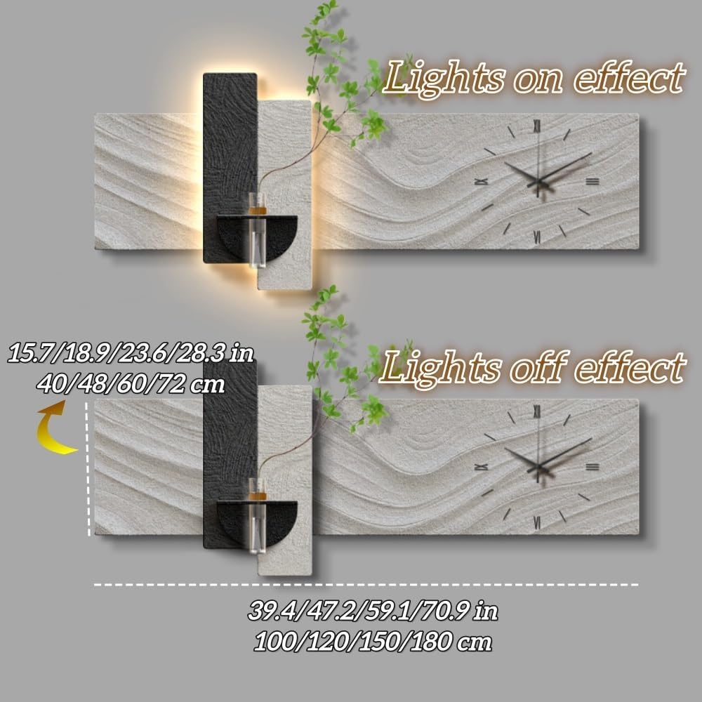 Product List:Wall decor*1Tips:1. Batteries are not included, you need to buy AA batteries yourself2. Due to different light, the product you received may have a slight color difference3. Due to manual measurement, there may be an error of 0.4-1.2 inchesThis wall art decor creates a welcoming atmosphere in any indoor space. Whether placed in the living room, bedroom, or hallway, the soft backlight and sandstone texture make the wall clock and glass vase stand out beautifully. The included faux plant brings a hint of greenery, making the space feel lively and balanced.The hanging wall decor also fits effortlessly into commercial environments. In offices, cafés, restaurants, or hotels, the combination of wall planter, gentle lighting, and elegant design adds warmth and charm, making every corner feel more inviting and thoughtfully styled.