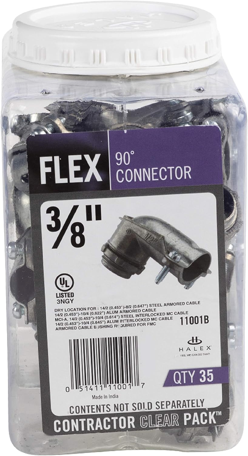 These 3/8 in. 90° Flexible Metal Conduit (FMC) Connectors (35-Pack) connect and bond FMC to steel outlet boxes and other metal enclosures. They are designed with a reversible locknut. They cut through protective coatings to establish ground continuity.