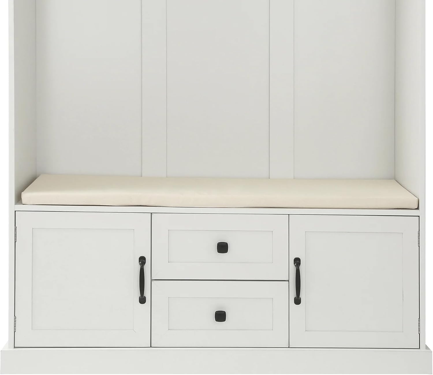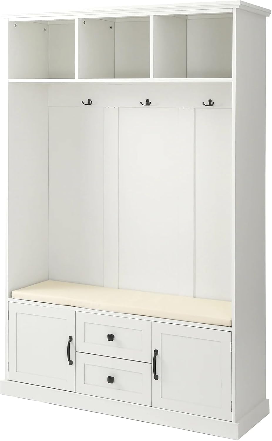 Classic details give our Storage Locker a traditional look, but clean lines and a modern finish bring this hall tree into the now. Generous, sweeping crown molding accents the top of the case; 3-open cubbies lie below it, awaiting your display items, books, accessories and more. The open area beneath the cubbies features elegant beaded-board paneling, 3-double hooks Compatible with coats and bags, and a comfortable seat with cushion. The grand finale of this mudroom storage piece, 2-drawers and 2-doors that allow you to store away even more necessitie.