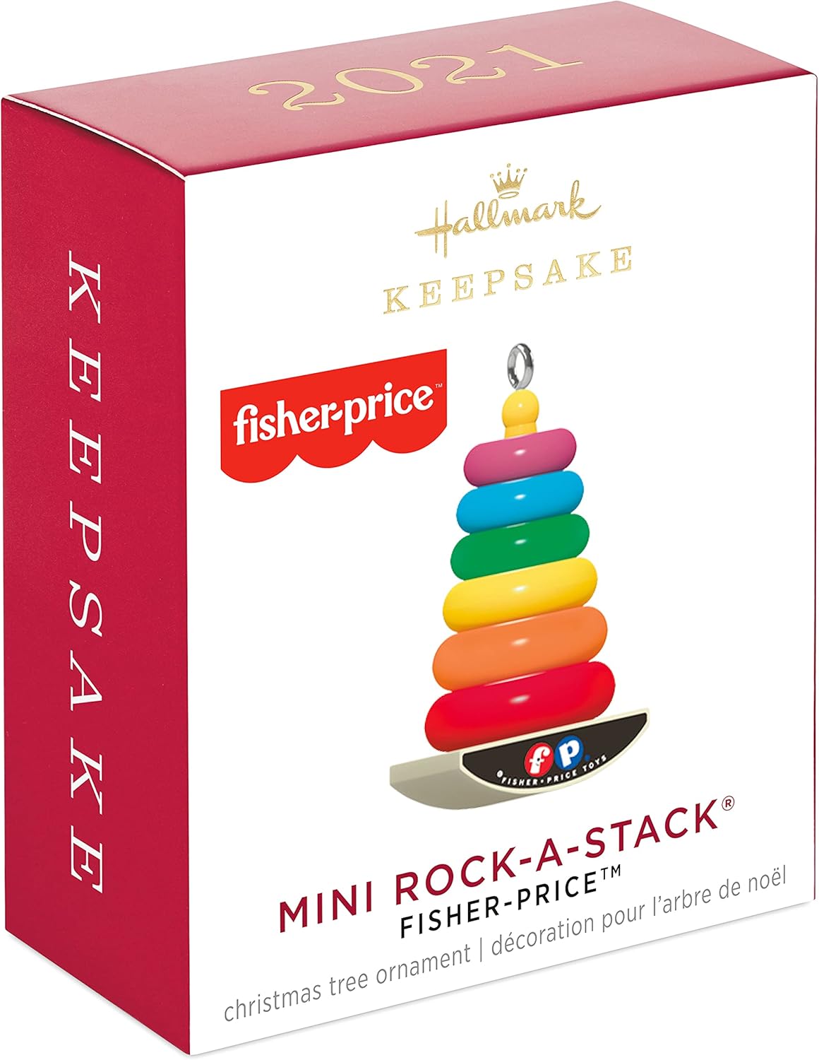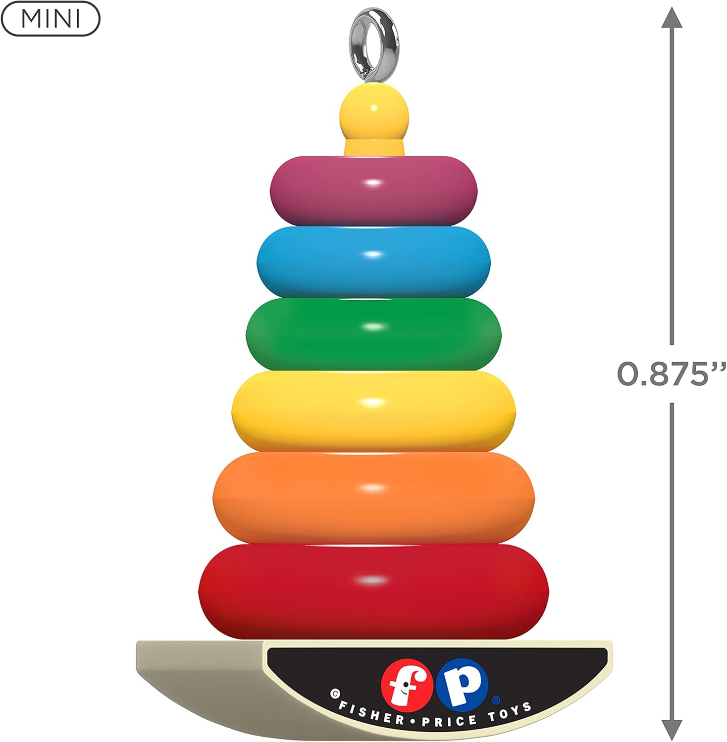 Add a nostalgic touch to your holiday decorating with this fun baby toy Christmas tree ornament. The miniature decoration features a retro design of the timeless Rock-a-Stack toy by Fisher-Price that has entertained generations of toddlers. Start a tradition of decorating a tabletop tree with the kids with this fun little piece.