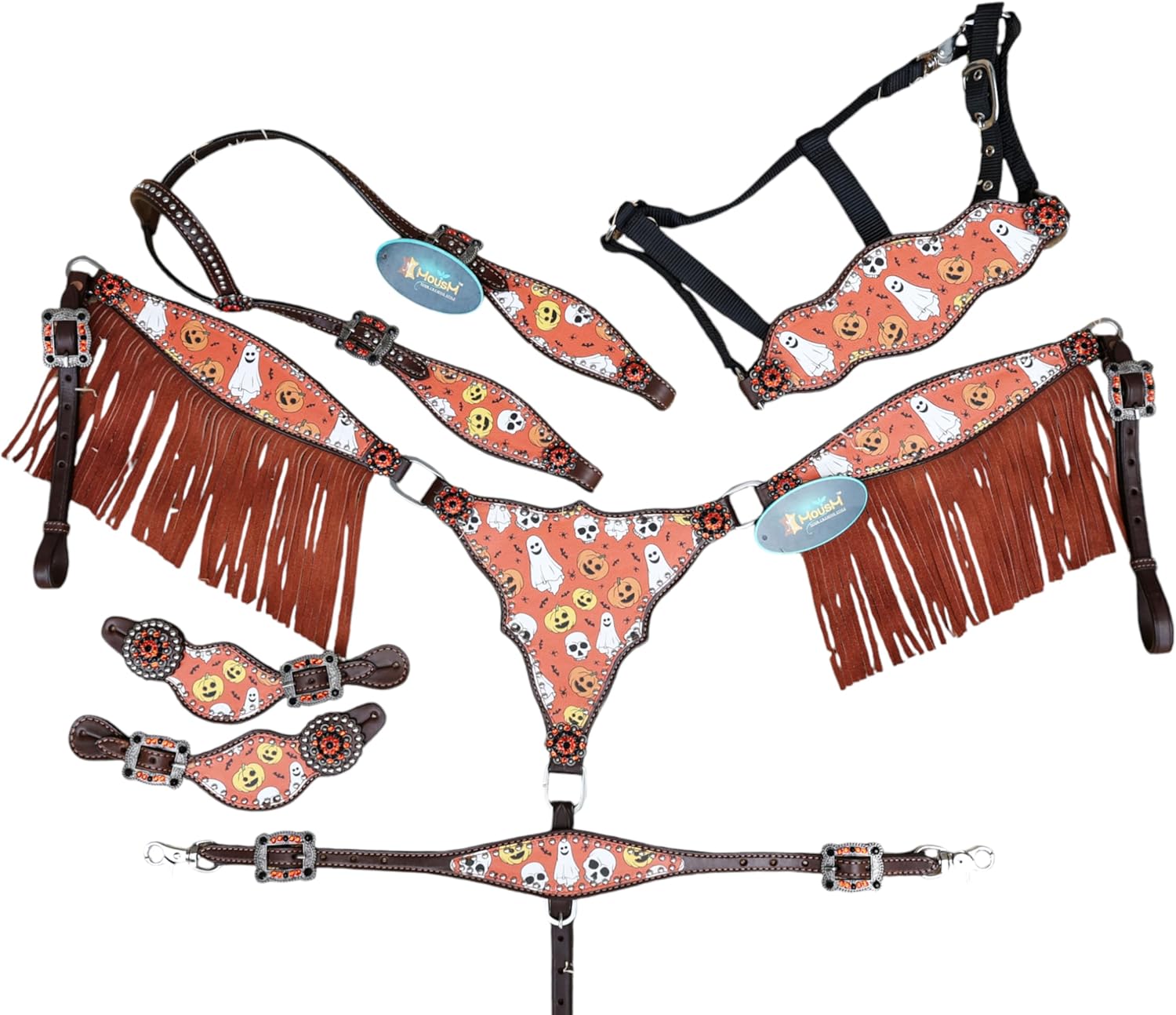 Elevate your horse’s Halloween style with this stunning Western Leather Headstall and Breast Collar Tack Set. Crafted from high-quality leather, this set is designed for both functionality and fashion. The vibrant **fluorescent Halloween pumpkin print** adds a festive touch, perfect for seasonal rides or parades. **Rhinestone conchos** add a touch of sparkle, making your horse stand out with elegance. Whether you're gearing up for a costume event or simply adding flair to your everyday riding, this tack set combines durability and design with an easy-to-use fit. Ideal for Western riders looking to celebrate the spooky season with style!