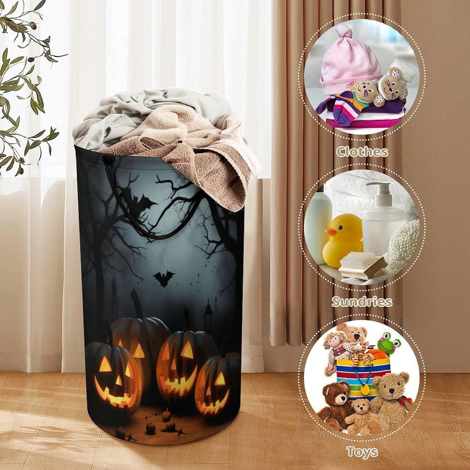 The pattern of the Halloween with Pumpkins hamper is printed with exquisite patterns, which makes the product more attractive.Chic design allows it to be used in the living room to hold throw blanket, pillows, and reading materials, as well as in the bathroom for towels, or as a laundry hamper.The laundry hamper adopted collapsible design, equipped with handles. It is lightweight and portable for using, storing, and moving conveniently.Halloween with Pumpkins Clothes hamper is suitable to store dirty clothes washing, place in the room to store toys, and other household goods, keep the house clean and tidy. Perfect laundry hamper for home, office, closet organizer, bedroom, bathroom, college dorm, etc.Gets out of your way when you need it to. This storage basket or laundry hamper is a good gift, which not only meets everyday storage needs but also carries deep care and love, a perfect way to turn thoughtfulness into warmth.