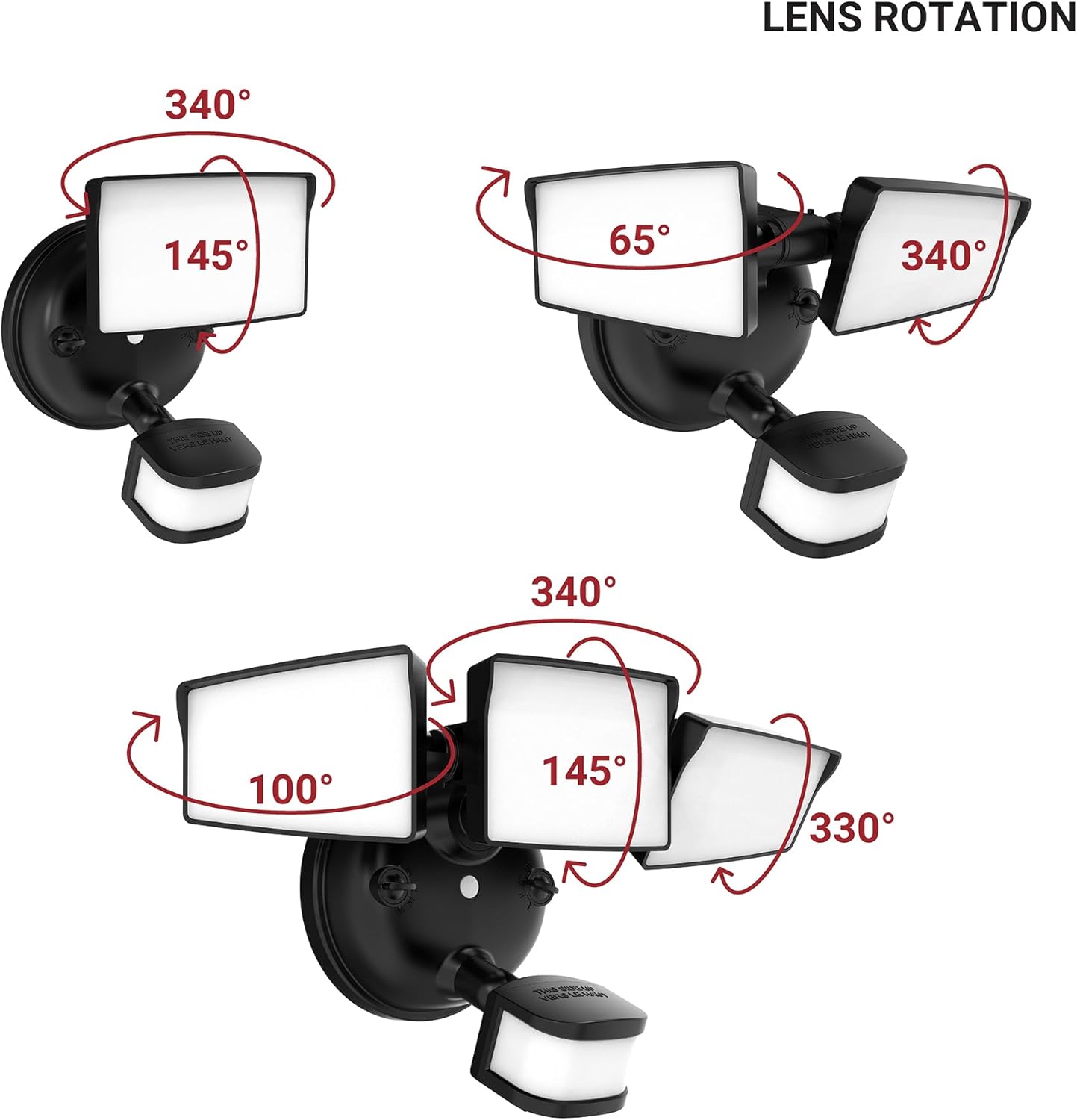 Designed for fast, frustration-free installation, this LED security floodlight features a 15-foot AC power cord that lets you mount it where you need it and power it from a standard outlet—no electrician, no hardwiring, and no downtime. Upgrade dark outdoor areas in minutes with bright, adjustable lighting that boosts visibility and helps deter unwanted visitors. Three lighting modes let you control functionality and energy usage: dusk-to-dawn, motion sensing, and a combined setting—automatic nighttime lighting that boosts brightness when movement is detected. The twin-head design delivers up to 2500 lumens and lets you fine-tune brightness from 25–100%. Select from 5 color temperatures, from 2700K to 6500K. Wet Location listed and rated for up to 50,000 hours of efficient performance, this outdoor floodlight delivers dependable lighting with virtually no maintenance. Backed by a 5-year limited warranty and a US-based support team, it’s a simple, versatile upgrade