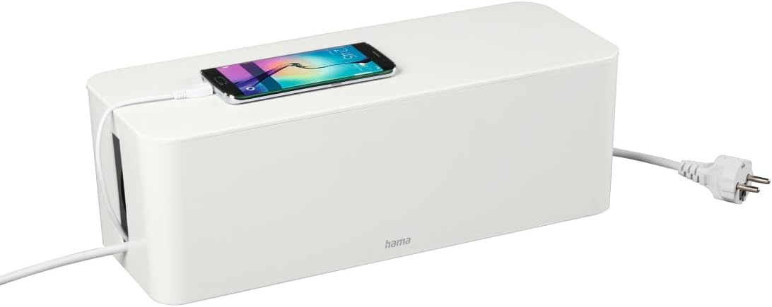 Hama Maxi Cable Box (Cable Box for Power Strip, Easy Cable Management, for Office, Desk, Home, Storage of Chargers, Hard Drives etc., with Rubber Feet) White With the cable protection box "Maxi" from Hama keeps things tidy despite tangled cables. The plastic box is ideal for hiding plugs and cables in addition to a six-way socket with switch, making it easy to create a tidy environment. At the same time, the cable management box protects your contents from curious children's hands, teeth and claws of pets such as dogs, cats, rabbits, guinea pigs etc. as well as dust and dirt. With two slots on opposite sides that serve as both cable entry and cable outlet, access is particularly easy. In addition, the air circulation inside the box is optimised. Thanks to the rubber feet, the cable organiser is non-slip and safe - whether on the desk or underneath, whether behind the TV or on the floor, in the living room, bedroom or in the office. The maxi cable box offers plenty of space to store power supplies, chargers, hard drives, memory sticks and much more. accommodation. The universal cable organiser has a simple, reduced design and fits into any living space. You were looking for: cable box large, cable box white, cable box desk, cable box under desk, cable management box, cable management box, cable management for desk, cable management white, table cable management, cable protection dog, cable protection for cats, cable protection animals, cable protection cat, socket hiding, solution for tangled cables, storage box for cables, cable boxes to prevent tangled cables, cable storage boxes, hide cable behind TV, cable box, cable box for 6 power strip, cable organiser box, cable organiser box, cable organiser box, cable organiser box. Cable Manager, Cable management white Technical details: Colour Akeneo: White Colour: white. Colour: white. Material: plastic. Width x Depth x Height 16 x 6.1 x 5.3 inches Cable diameter: 20 mm.