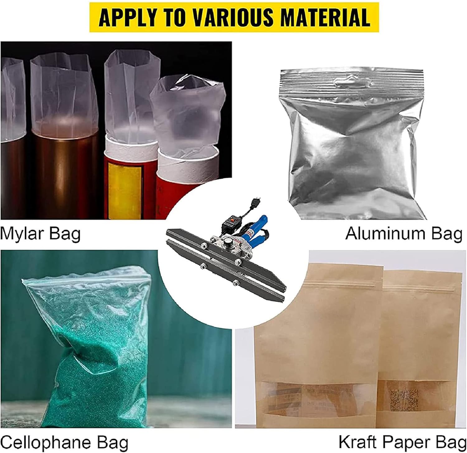Steps for usage1 : Turn on the power, the POWER indicator lights up.2: Adjust the temperature, according to the thickness and material of the material, rotate the temperature control table, decrease in the direction of OFF, increase in the direction of 300°C.3: During preheating, the HEATING light will be on, and the light will be off when the temperature is reached.4: Put the plastic bag on the sealing surface, press the handle, hold for 1-5 seconds, release the handle to seal it,Specification:Material: Stainless steelPower: 550WTemperature control range: 0-300℃Sealing width: 10mmSealing length: 20cm (7.9 inch), 30cm (11.8 inch), 40cm (15.7 inch), 50cm (19.7 inch), 60cm (23.6 inch)Packing:1*Heat SealerNotice:The heat sealer is equipped with an overload protector and leakage protection switch. When the power on, you can press the button to avoid an accident. The machine will trip out automatically when it overloads.