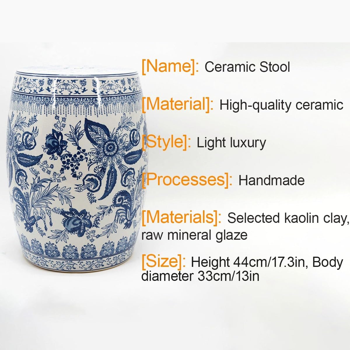 JDPYURV has spent years refining the craft of producing Chinese garden stools, with a strong focus on ceramic craftsmanship alongside carefully constructed wooden designs. What began as a small workshop has grown into an experienced manufacturer known for consistent quality and detailed finishing. Each stool is created to serve both decorative and practical purposes, bringing balance to indoor and outdoor spaces. JDPYURV garden stools reflect reliable craftsmanship built through years of dedication and manufacturing expertise.Inspired-by classic blue and white porcelain artistry, this elegant-hand painted garden stools piece brings timeless oriental charm into modern living spaces. Designed as a premium ceramic garden stool, it features intricate hand-painted patterns with up to 31 unique designs, making each piece a collectible work of art. This refined decorative ceramic garden stool perfectly embodies the beauty-of a chinoiserie ceramic drum indoor/outdoor garden stool.Each chinoiserie ceramic stool is carefully hand-polished and hand-painted, then fired at 1280°C for superior strength and a smooth glossy finish. This chinese garden drum stool offers durability for everyday use while remaining lightweight and easy to reposition.Versatile and functional, this chinese drum stool serves as a seat, side table, or decorative accent. Whether used as a ceramic stool indoors or as ceramic garden stools outdoor, it enhances living rooms, patios, balconies, and more. This garden stool ceramic is easy to clean and designed to maintain its-elegance over time.UsesEntryway shoe changing stoolLiving room accent table or seatingBedroom bedside tableBalcony or patio seatingGarden decorative pieceBathroom stool or extra seatingSpecificationsMaterial: Ceramic (Blue & White Porcelain Style)Craft: Hand painted, hand polishedDesign: 31 pattern optionsStyle: New classic Chinese styleFiring Temperature: 1280°CFeatures: Durable, portable, easy to cleanPackage Includes1 × Ceramic Garden StoolNotesManual measurement may vary by 0.4–0.8 inches. Please refer to the actual product.Due to-lighting and monitor differences, slight color variations may occur.Due to shooting angles, visual size differences may exist; please refer to actual dimensions.