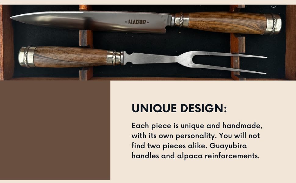 Handcrafted Grill or Barbecue Knife and Fork Set. This unique set includes 1 fully forged sharp meat knife and 1 fork, all carefully crafted to bring you unparalleled quality and style. Enjoy authentic Argentine elegance in every bite! Elevate your culinary experiences with our exquisite handcrafted Cutlery Set. This set is the perfect combination of elegance and functionality. Each piece of our cutlery set is carefully crafted by expert artisans, guaranteeing exceptional quality that is reflected in every detail. The guayubira and alpaca wood handle adds a touch of warmth and comfort to every grip, while the razor-sharp stainless steel blades provide durability and strength. Giving you the versatility you need to serve a wide variety of dishes, from grilled meats to barbecue cuts. Our flatware set comes with an elegant and sturdy cedar wood case, which not only serves as convenient storage to protect your flatware, but also adds a touch of refinement to your table. Experience the satisfaction of using superior quality flatware that enhances your dining experience with every meal. Built to stand the test of time, our flatware set is a lasting investment that will be with you for years to come. Whether you're enjoying a casual barbecue with friends or celebrating