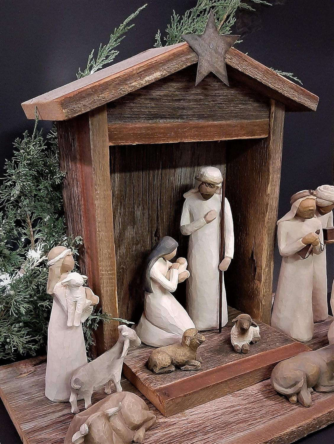 This is a handmade creche / manger / stable for displaying your Willow Tree Nativity Set (not included) made from old weathered barnwood. There is also a corded light that lights up the inside of the creche. The upper part separates from the base for easier shipping and storage. Every original barn wood board varies in color and weathering due to age, location, natural characteristics such as knot holes, nail holes, etc, so I can not guarantee that a creche will look exactly like a specific picture. The base is approx 10" x 20" and the height is approx 16". The front opening is approx 9" wide x 10-1/2" high. The Nativity Set pieces shown in the pictures are for visual purposes only and are NOT included. Shipping outside the lower 48 states may require additional postage. Contact me with any questions. Thanks for looking!